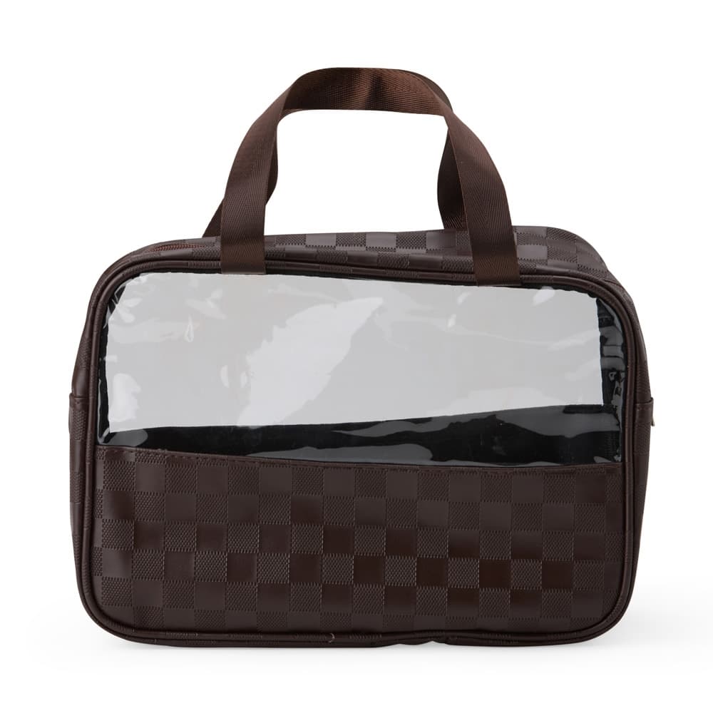 Nécessaire de PVC e couro sintético impermeável em xadrez . Possui visor transparente e duas alças laterais de mão em nylon.