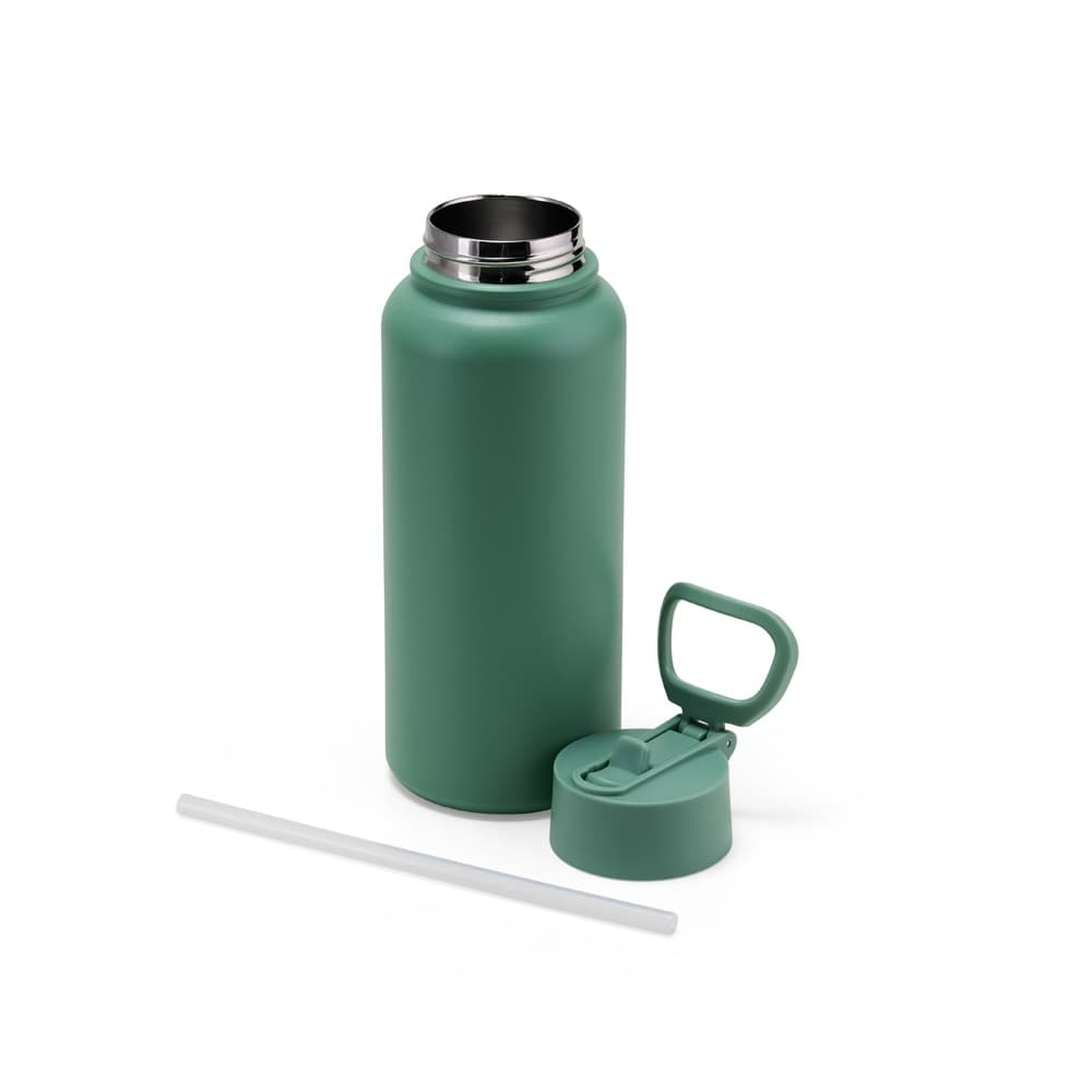 Garrafa térmica de parede dupla em inox, capacidade de 900ml. Tampa rosqueável com alça de transporte, bico flip e canudo interno.