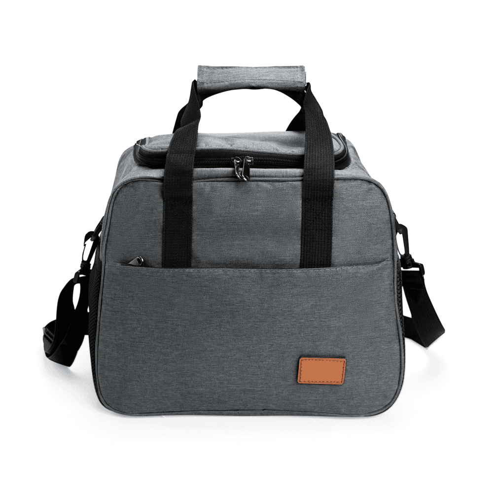 Bolsa térmica confeccionada em Oxford com fechamento em zíper e capacidade de até 22 litros. O compartimento interno possui revestimento térmico em PEVA. Conta com bolso frontal de zíper com plaquinha de couro sintético fixada com velcro, além de um par de bolsos laterais em tela de tecido respirável com elástico. Apresenta ainda duas alças de mão com suporte de juntura e alça transversal regulável e removível, com mosquetões para encaixe nas fivelas laterais.