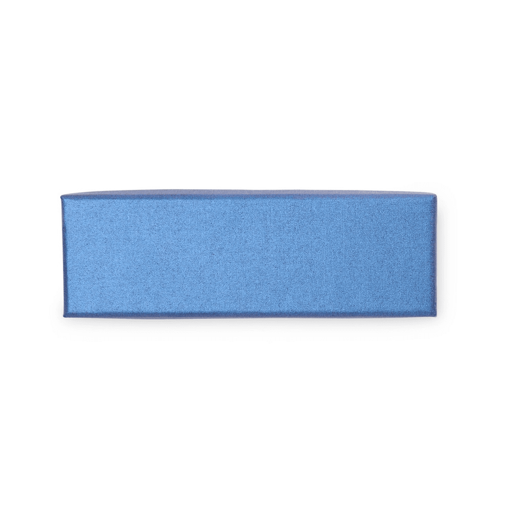 Estojo em papelão e revestimento removível de duas camadas em espuma com espaço para guardar uma caneta ou lapiseira.