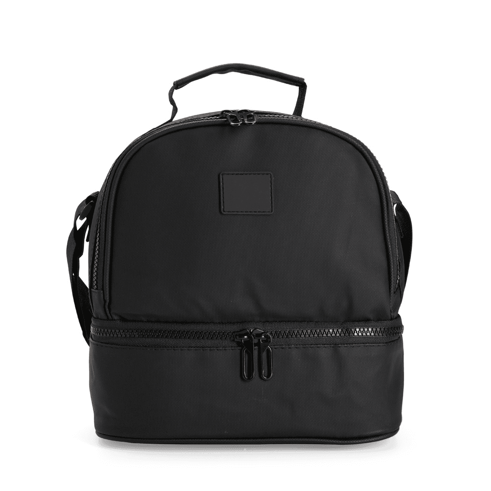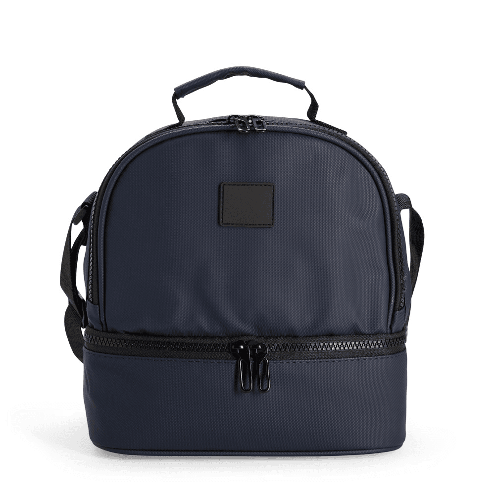 Bolsa térmica confeccionada em poliéster mesclado com PVC impermeável, fechamento em zíper e capacidade de até 7 litros na soma de seus dois compartimentos térmicos individuais revestidos em PEVA atóxico. Conta com placa emborrachada para personalização, uma alça de mão e alça transversal.