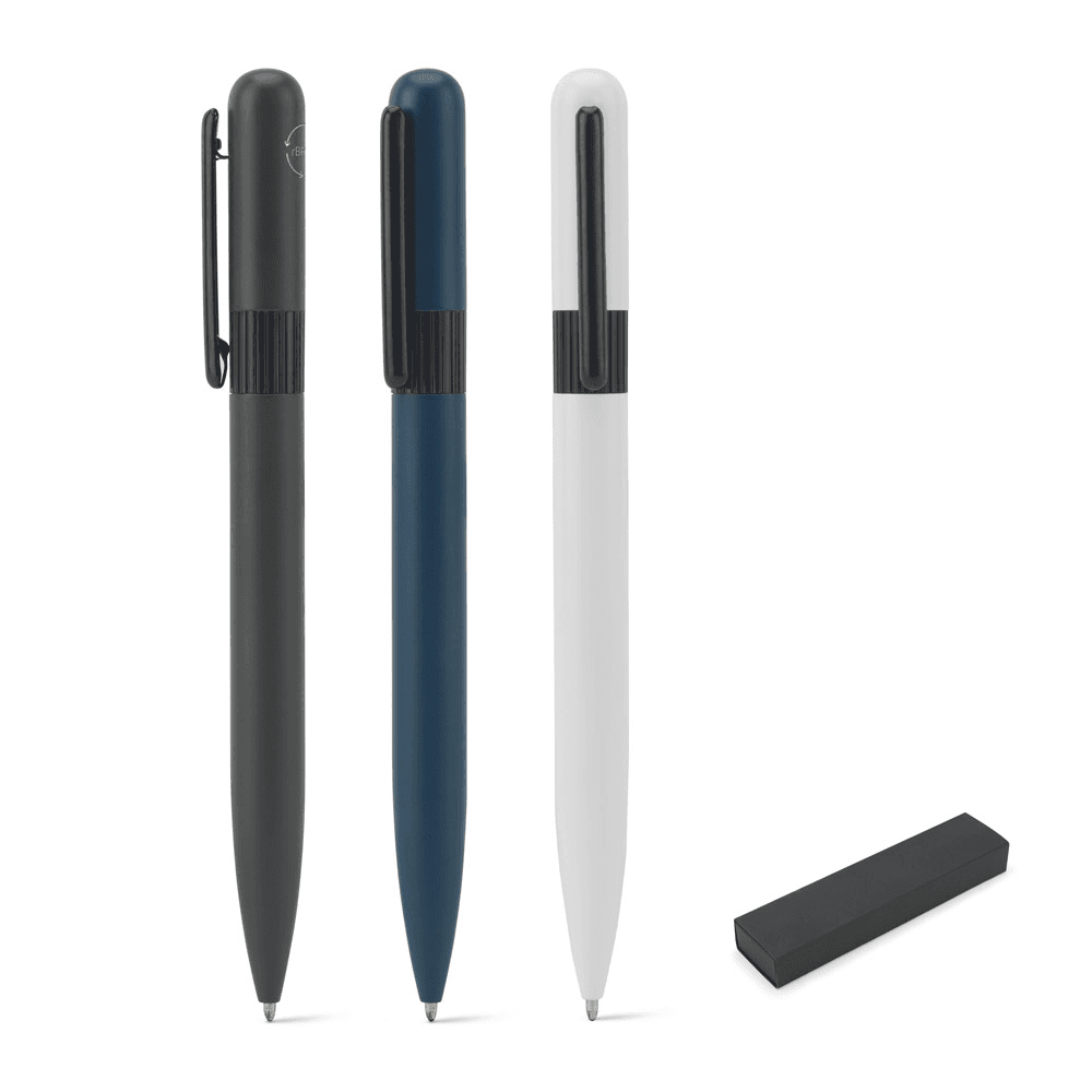 Esferográfica em metal 60% reciclado, com design arredondado para uma sensação de escrita harmoniosa. A esferográfica tem clipe, mecanismo twist e escrita em preto até 1,5 km. Fornecido em caixa presente de papel proveniente de gestão florestal sustentável. Esferográfica: ø11 x 138 mm | Caixa: 170 x 40 x 22 mm