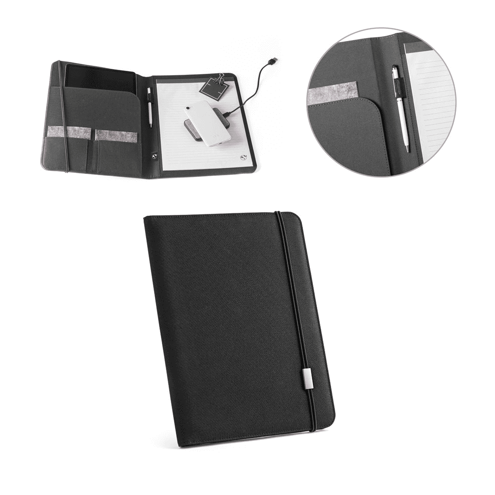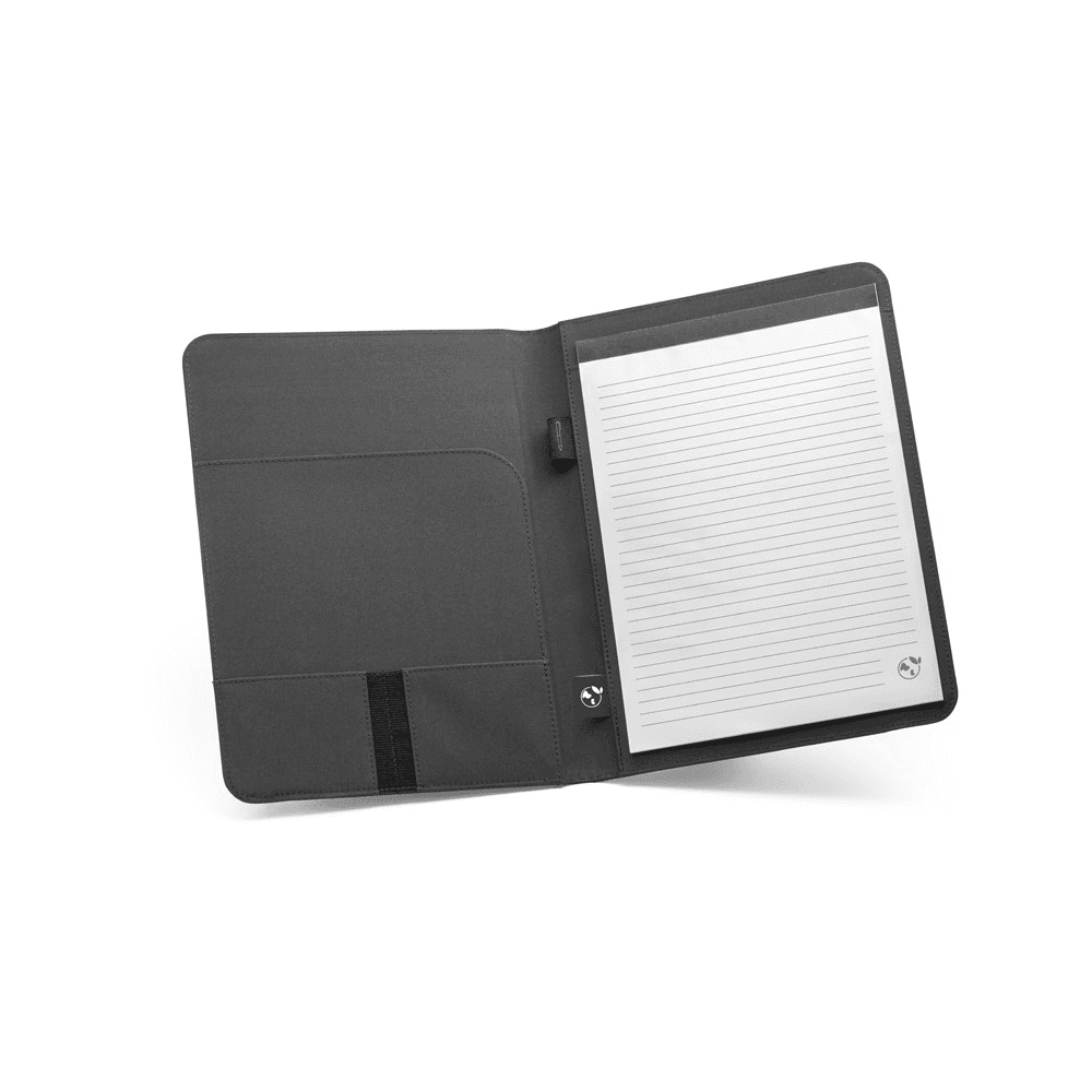 Pasta A4 em 300D poliéster 100% reciclado, com elástico para fecho. O interior contém vários bolsos, suporte para esferográfica (não inclusa) e um caderno com 40 páginas pautadas, em papel proveniente de gestão florestal. Fornecida em bolsa non-woven. 230 x 330 x 50 mm