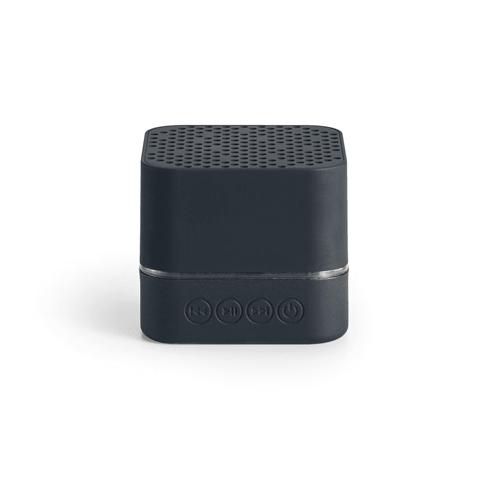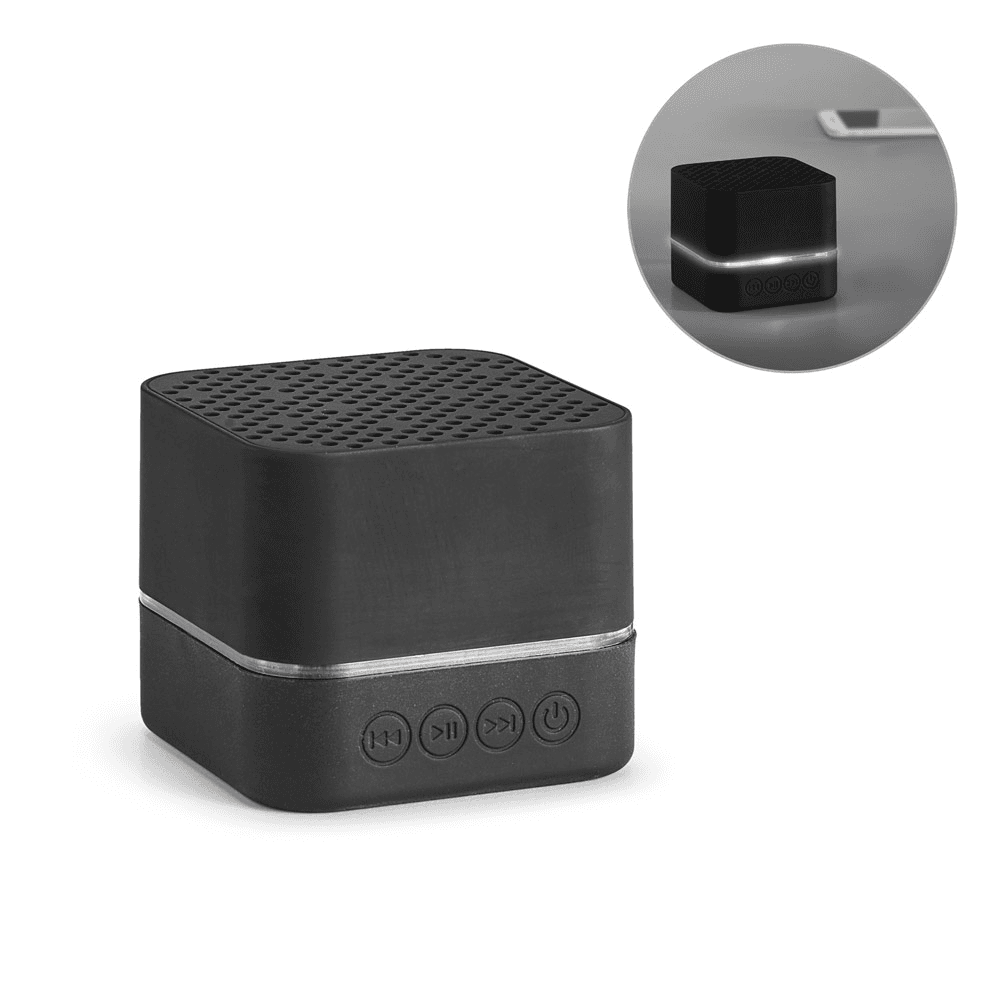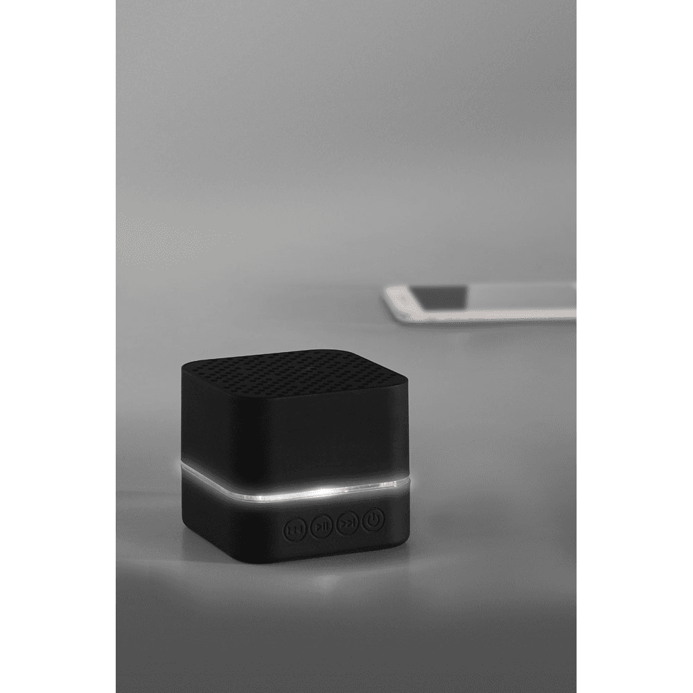 Caixa de som portátil, com luz LED no interior, em ABS e acabamento emborrachado. (personalizável com logótipo iluminado). Transmissão sem fios BT v4.2 e potência de 3W (4Ω). Bateria com 300 mAh e autonomia aproximada de 2h. Incluso cabo 2 em 1: USB / micro USB para carregamento e micro USB/3.5 jack. Fornecida em caixa presente. 59 x 59 x 51 mm