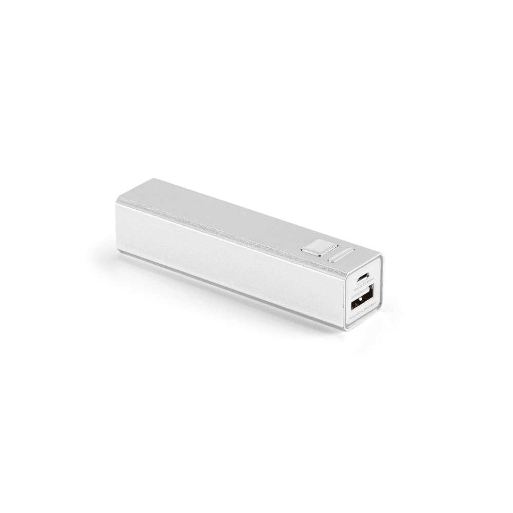 Bateria portátil em alumínio. Bateria de lítio com capacidade de 2.200 mAh, tempo de vida ≥ 500 ciclos, uma porta de entrada microUSB e uma porta de saída USB-A. Incluso cabo micro USB para carregar a bateria. Fornecido em caixa presente. 95 x 23 x 22 mm