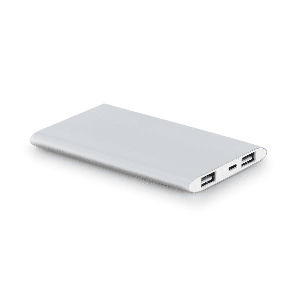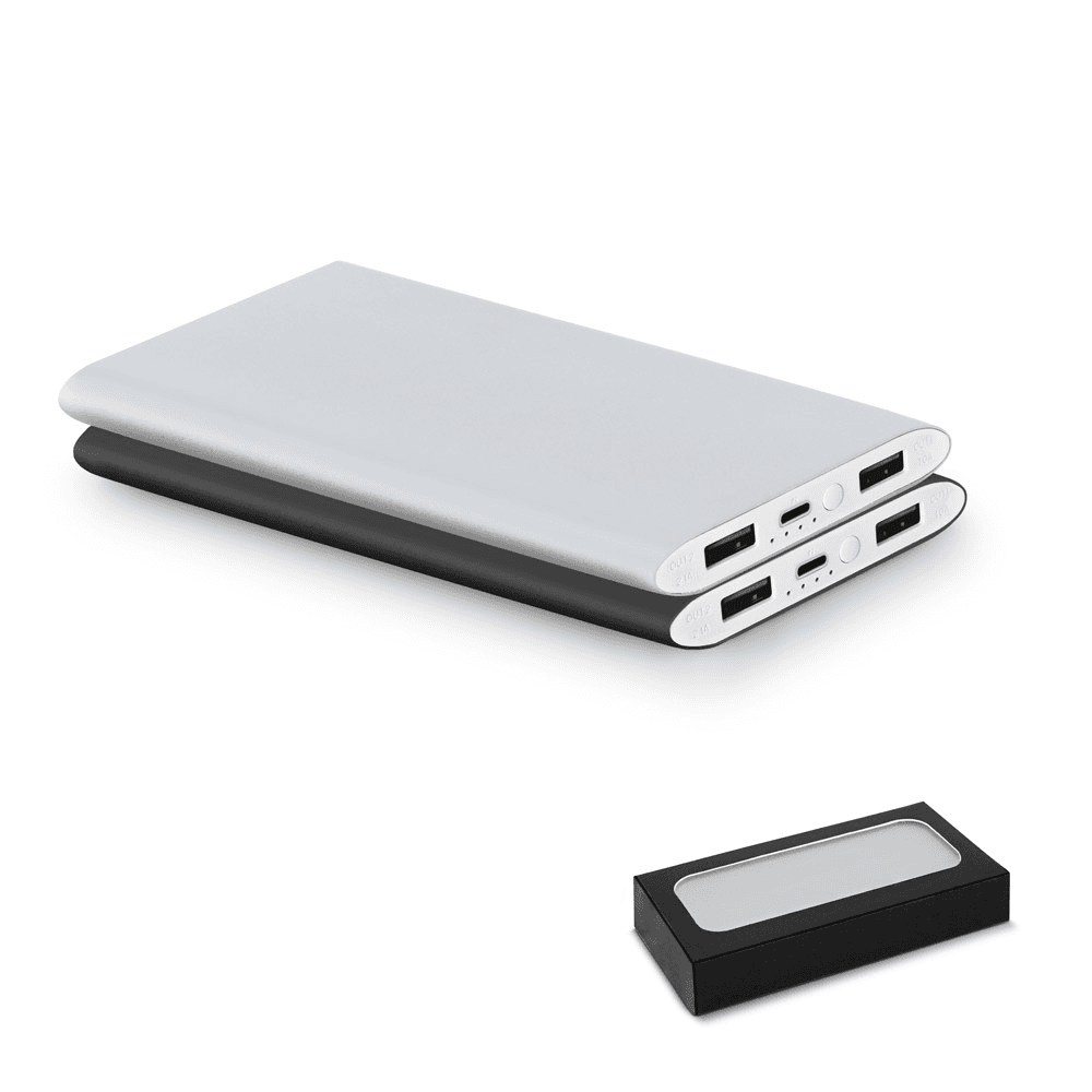 Bateria portátil em alumínio 100% reciclado. Bateria de lítio com capacidade de 7.200 mAh e tempo de vida ≥ 500 ciclos. Com porta de entrada USB-C e 2 portas USB-A de saída. Incluso cabo USB-A / USB-C para carregar a bateria. Fornecida em caixa presente. 150 x 74 x 12 mm | Caixa: 165 x 80 x 20 mm