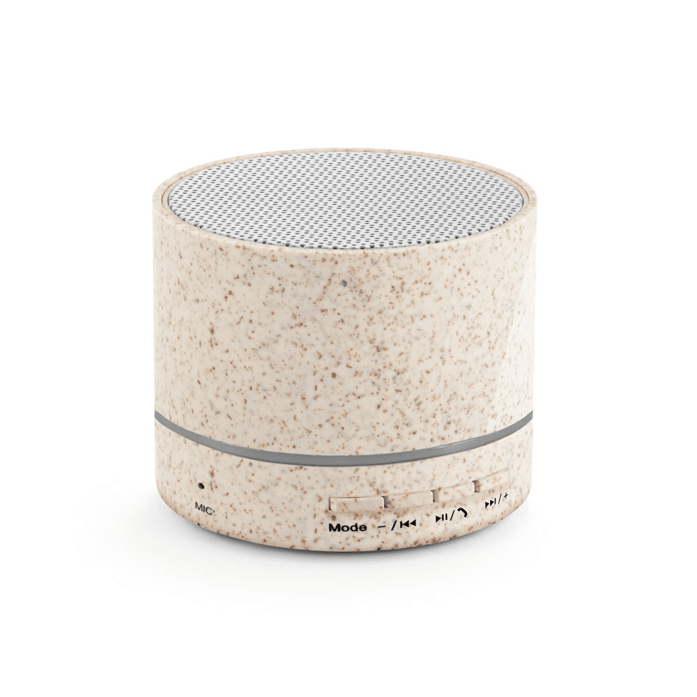 Caixa de som portátil em fibra de palha de trigo e ABS com microfone. Potência de 3W e transmissão sem fios BT v5.0. Autonomia aproximada de 2 horas e uma bateria de 300 mAh. Incluso cabo micro USB. Fornecido em caixa presente de papel kraft. ø62 x 48 mm