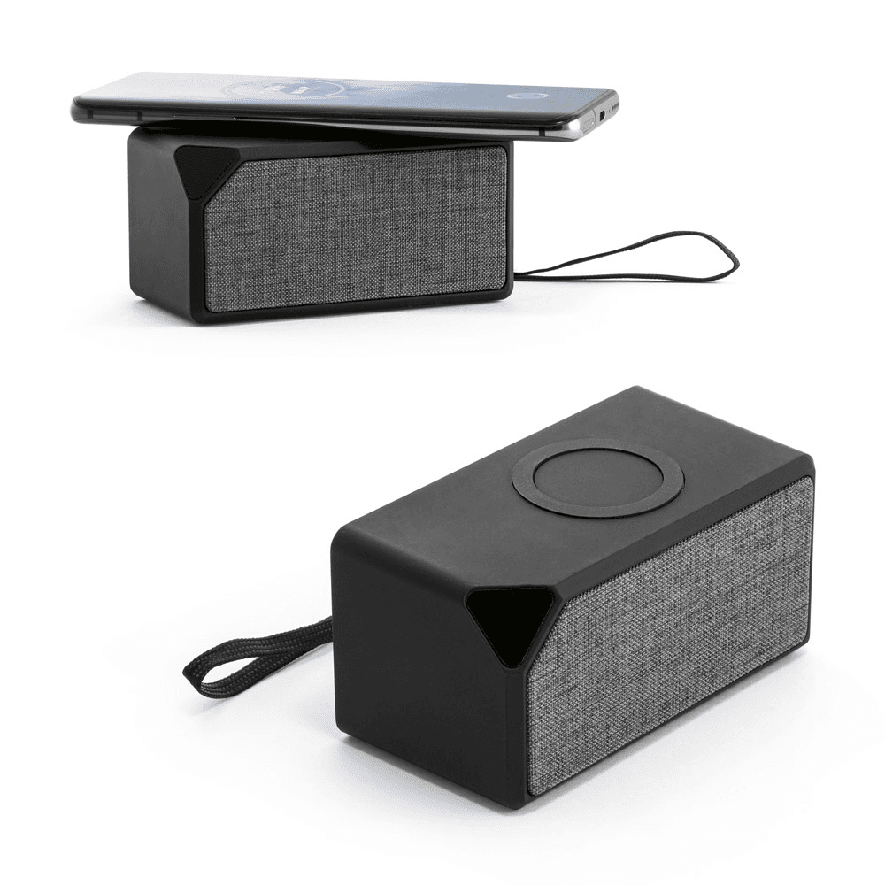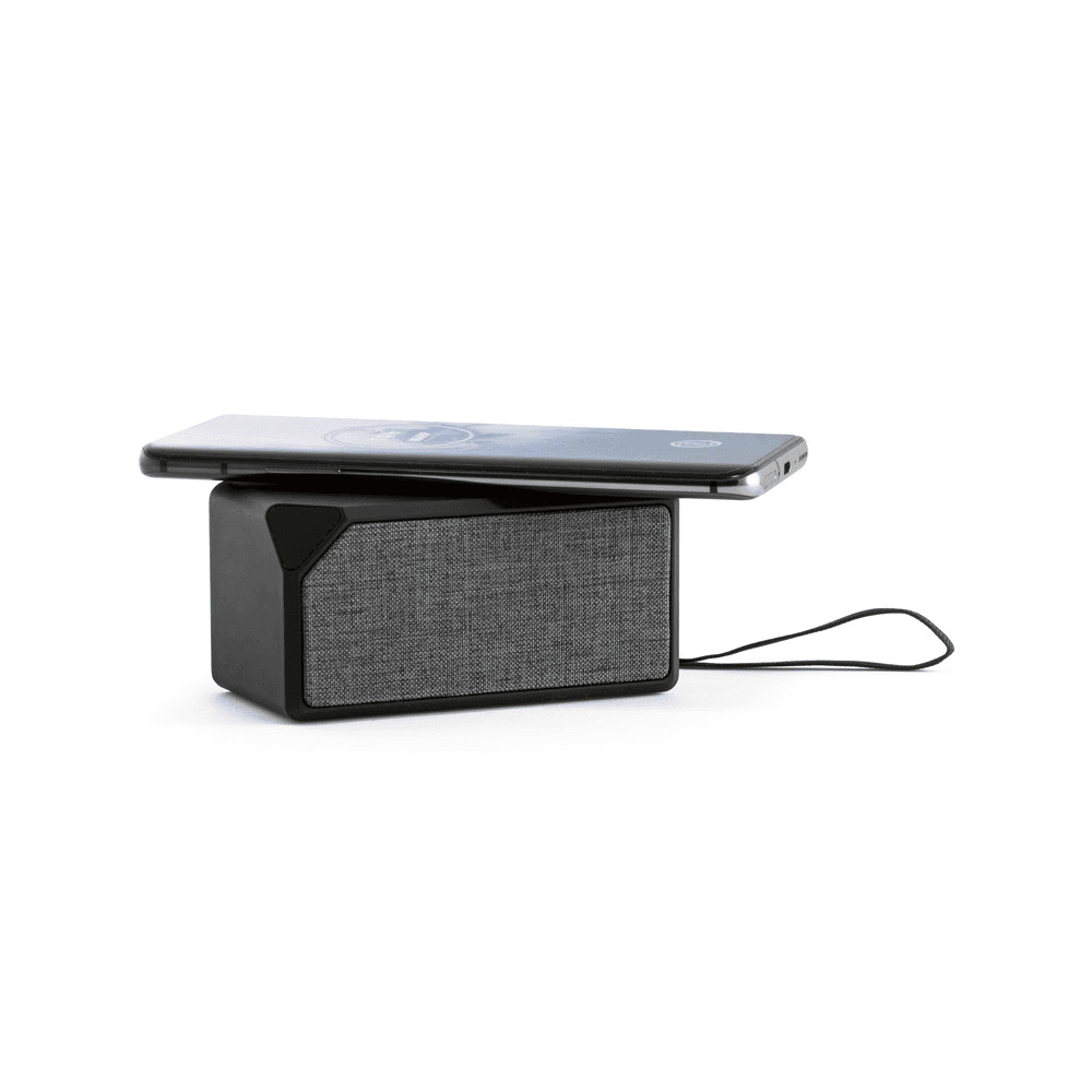 Caixa de som portátil em ABS com acabamento em borracha e tecido na parte frontal. De design sofisticado, esta caixa de som tem uma bateria de 300 mAh e autonomia aproximada de 2 horas, com transmissão sem fios BT v5.0 e potência de 3W. Adicionalmente tem também a funcionalidade de carregador wireless, com uma potência de 5 W. Compatível com dispositivos móveis com tecnologia de carregamento sem fios. Incluso cabo de carregamento USB. Fornecida em caixa presente. 108 x 56 x 54 mm