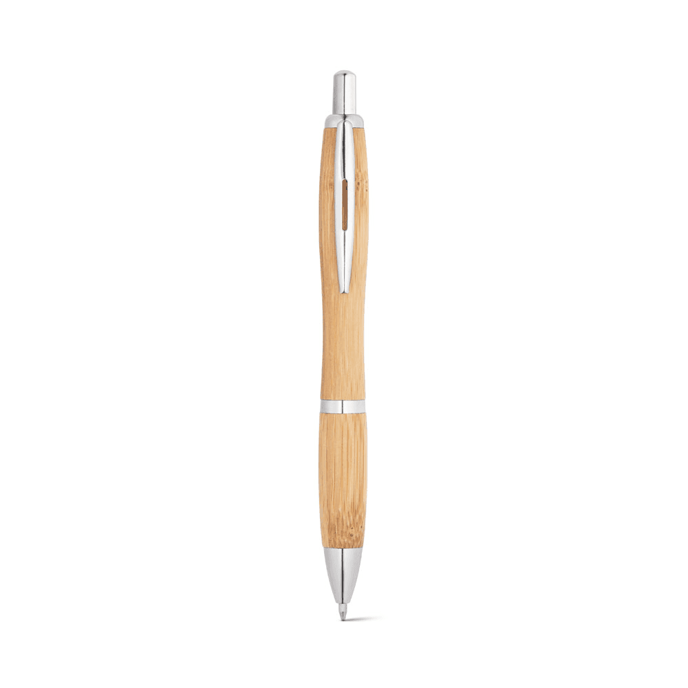 Esferográfica em bambu com clipe de metal. Escrita em preto até 1,5 km. A cor e o resultado da impressão nos materiais naturais pode variar entre produtos. ø13 x 143 mm