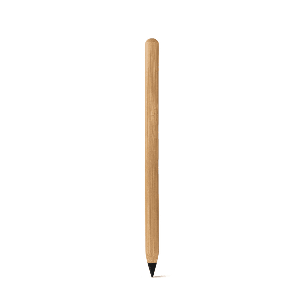Caneta sem tinta em bambu com ponta de grafite, tampa protetora plástica. Apta para um uso prolongado sem a necessidade de apontar e a escrita pode ser apagada. A cor e o resultado da impressão nos materiais naturais pode variar entre produtos. Ø8 x 138 mm