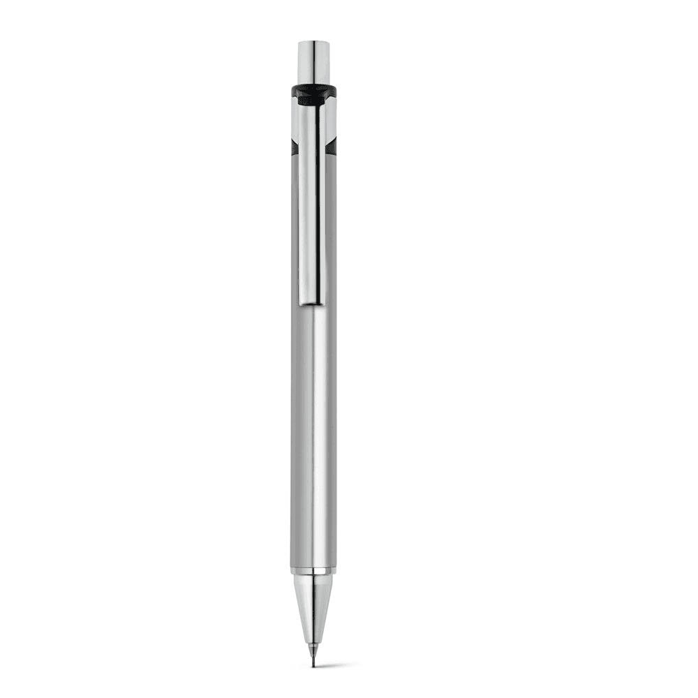 Conjunto de esferográfica e lapiseira em alumínio. Escrita em azul até 1,5 km. Lapiseira com grafite 0.5 mm. Incluso estojo. ø11 x 137 mm | Estojo: 165 x 50 x 24 mm