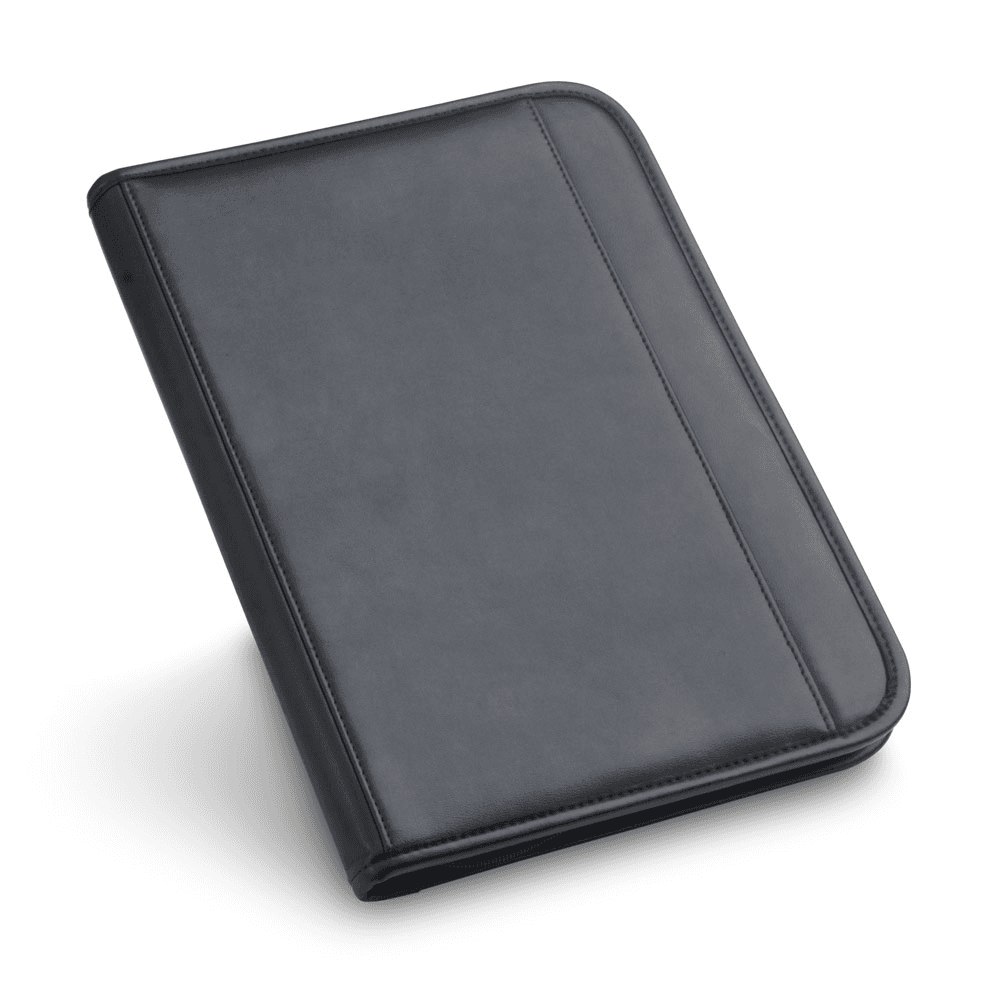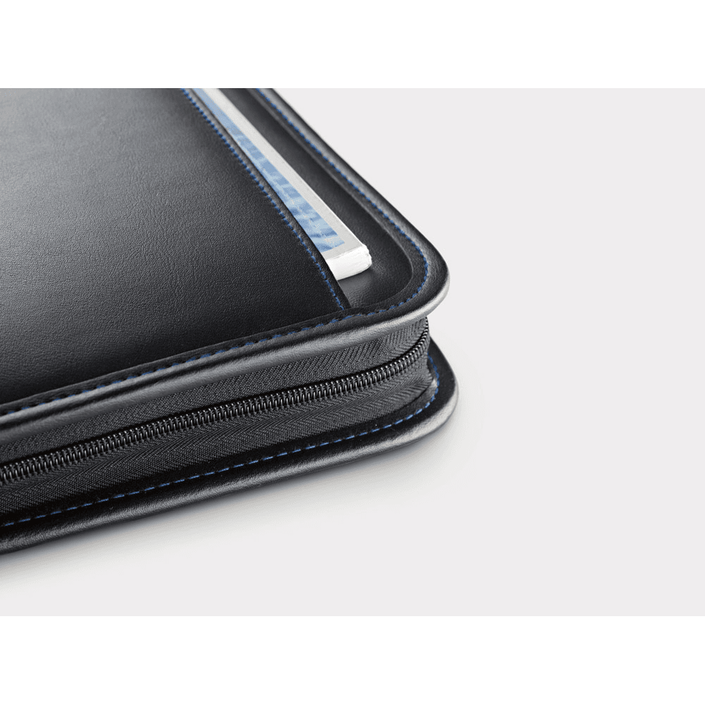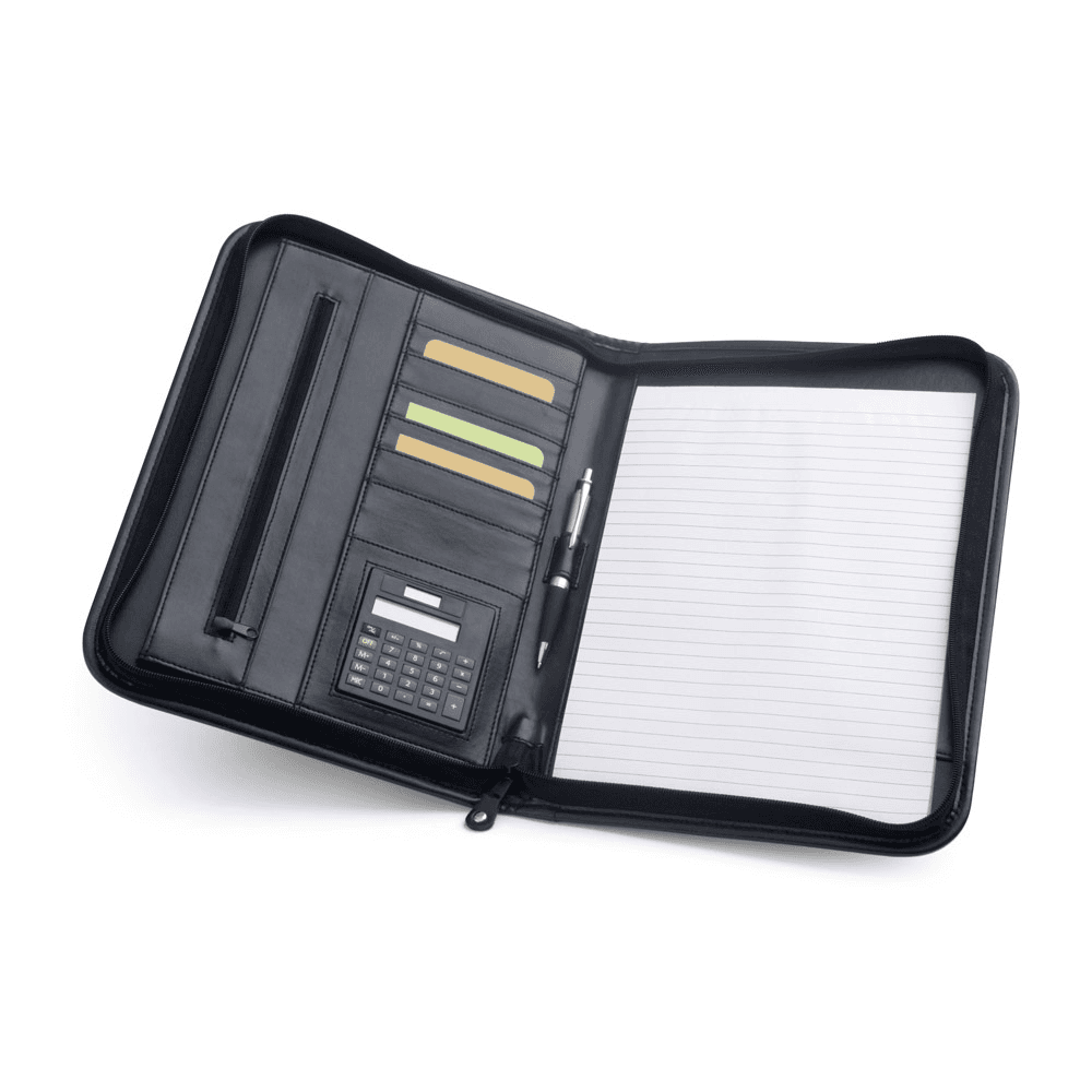 Pasta A4 em c. sintético, com bolso frontal e fecho. O interior contém um bloco de 40 páginas pautadas, suporte para esferográfica (não inclusa), vários bolsos e calculadora dual-power de 8 dígitos, com pilha LR1130 inclusa. 250 x 345 x 20 mm