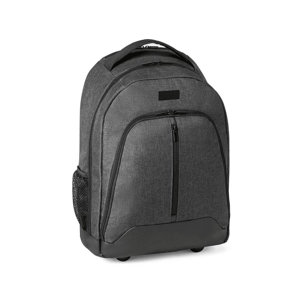 Mochila trolley para notebook em 600D de alta densidade e poliéster 600D impermeável. Possui um compartimento principal para notebook até 15.6’’, um bolso frontal com zíper e bolsos laterais em tela mesh. Mochila trolley com protetor de rodas e pega extensível em metal. Parte posterior e alças almofadadas. Placa metálica removível com imã para fácil gravação. Capacidade até 21 L e peso de 1,65 kg. 340 x 430 x 170 mm