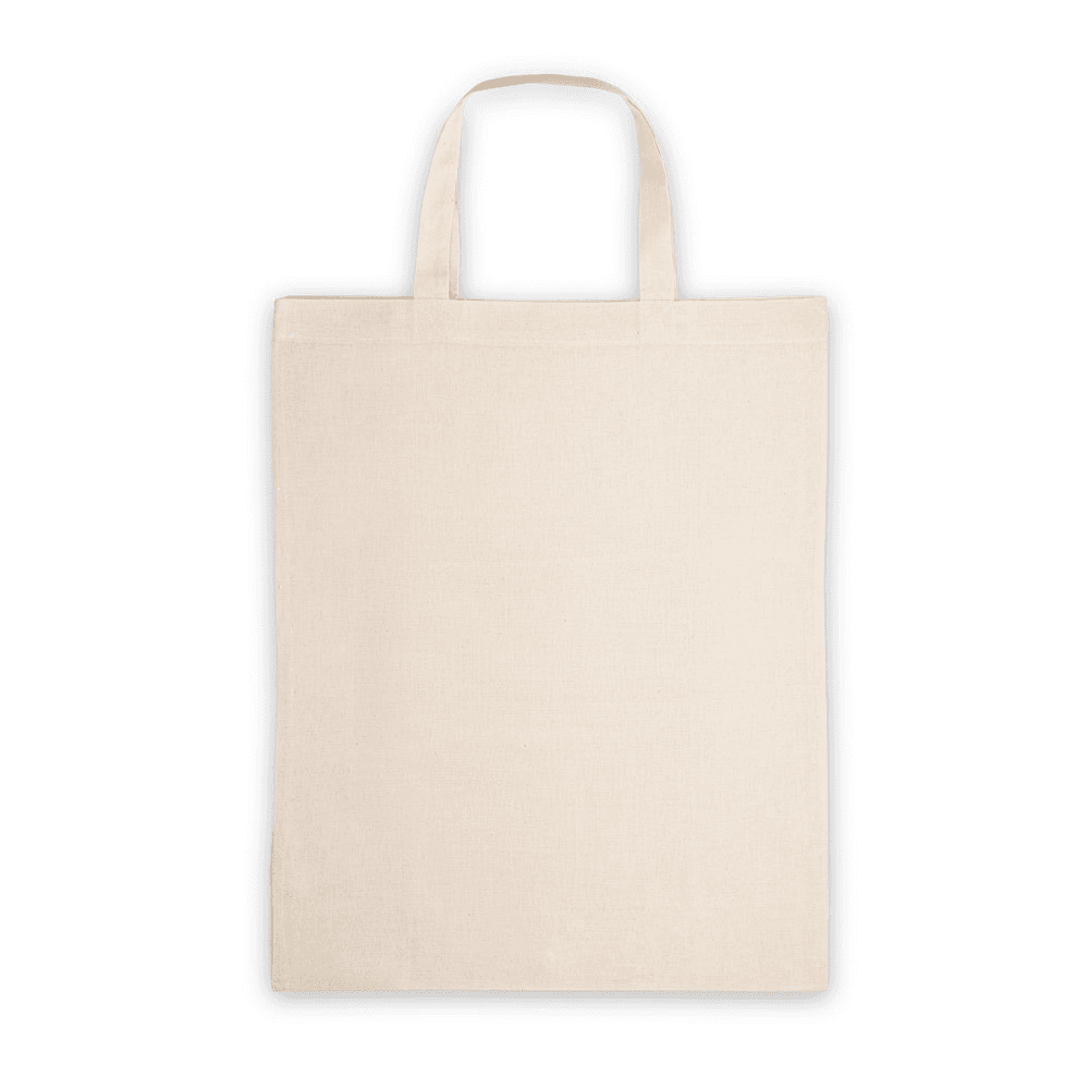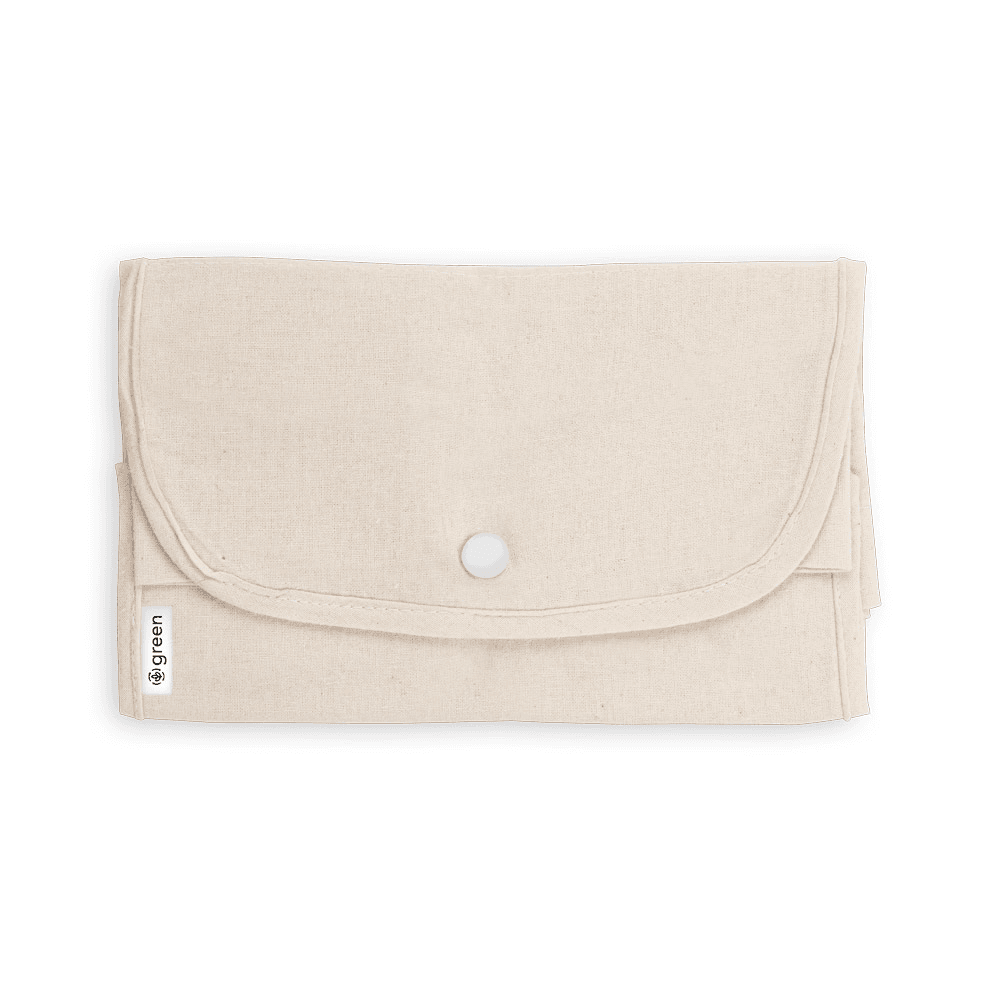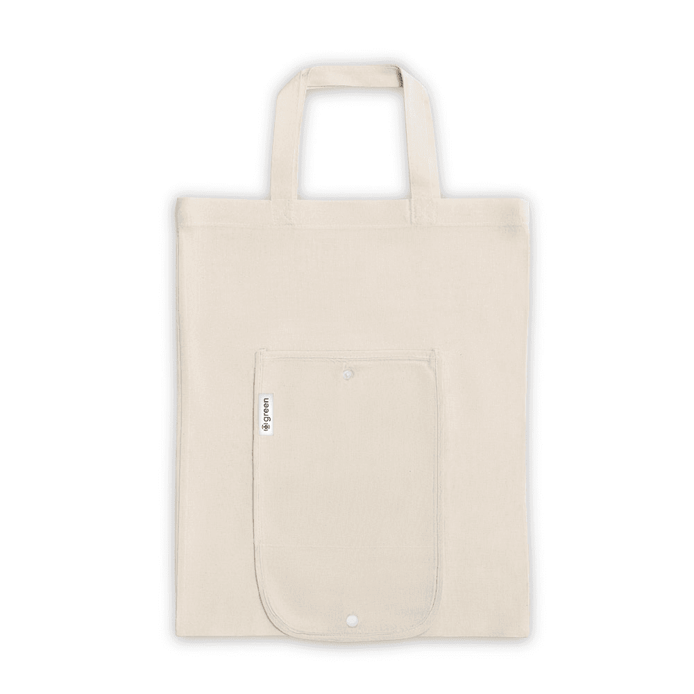 Sacola dobrável em 50% algodão, 30% algodão reciclado e 20% poliéster reciclado (140 g/m²), com alças de 38 cm. Aberto: 380 x 470 mm | Dobrado: 135 x 205 mm