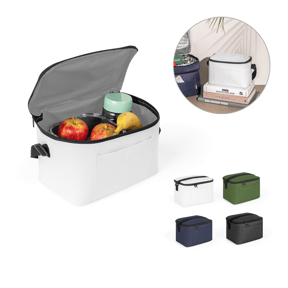 Bolsa térmico em poliéster reciclado 600D, com alça em webbing ajustável. Composto por um compartimento principal espaçoso e um bolso frontal. O interior forrado em PEVA garante um bom isolamento térmico permitindo a conservação do frio por mais tempo. Capacidade 7 L. 240 x 165 x 160 mm