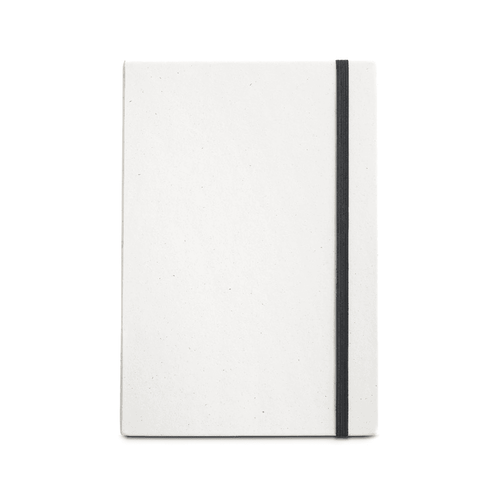 Caderno A5, de capa dura, produzida através de embalagens de leite recicladas, ajudando ao reaproveitamento do cartão e alumínio contido nas embalagens. Contém 160 páginas pautadas cor de marfim, em papel 100% reciclado, fita separadora e elástico para fecho do caderno. 145 x 210 mm