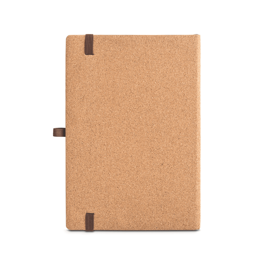 Caderno A5 de capa dura em folha de bambu e cortiça. Contém 160 páginas, em papel 100% reciclado, pautadas cor de marfim, fita separadora, suporte para esferográfica (não inclusa) e elástico para fecho do caderno. A cor e o resultado da impressão nos materiais naturais pode variar entre produtos. 140 x 210 mm