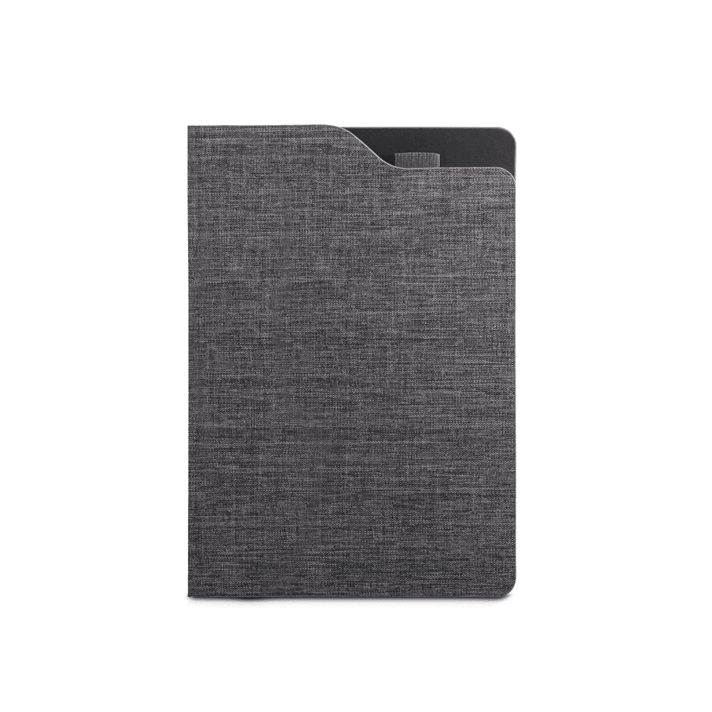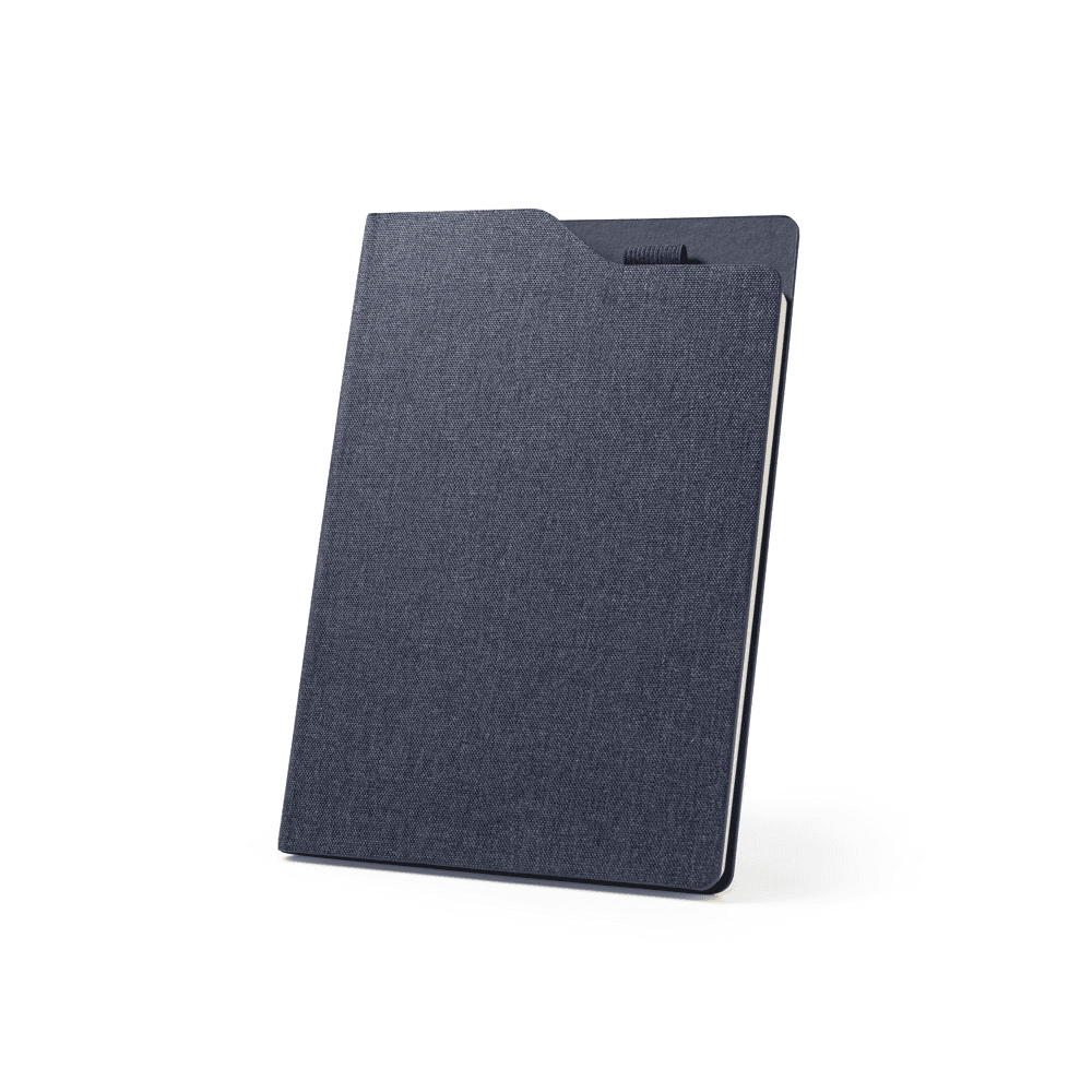 Caderno A5 de capa dura em tecido PET 100% reciclado (rPET). Contém 160 páginas pautadas em papel cor marfim 100% reciclado, fita separadora e suporte de esferográficas no topo do caderno (não inclusa). 148 x 212 mm
