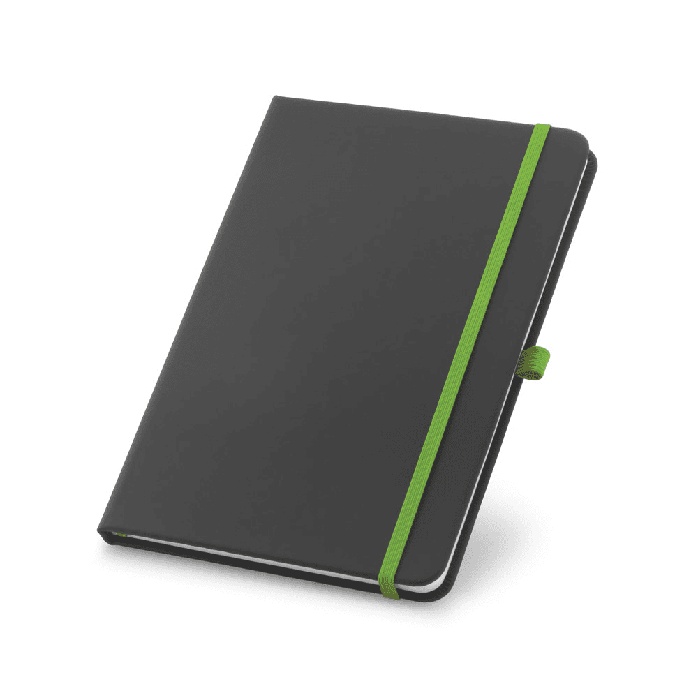 Caderno A5 de capa dura em c. sintético. Contém 160 páginas pautadas, fita separadora, elástico e suporte para esferográfica (não inclusa). 140 x 210 mm