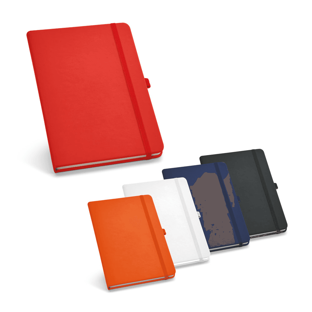 Caderno B6 de capa dura em c. sintético com 160 páginas lisas. 120 x 170 mm