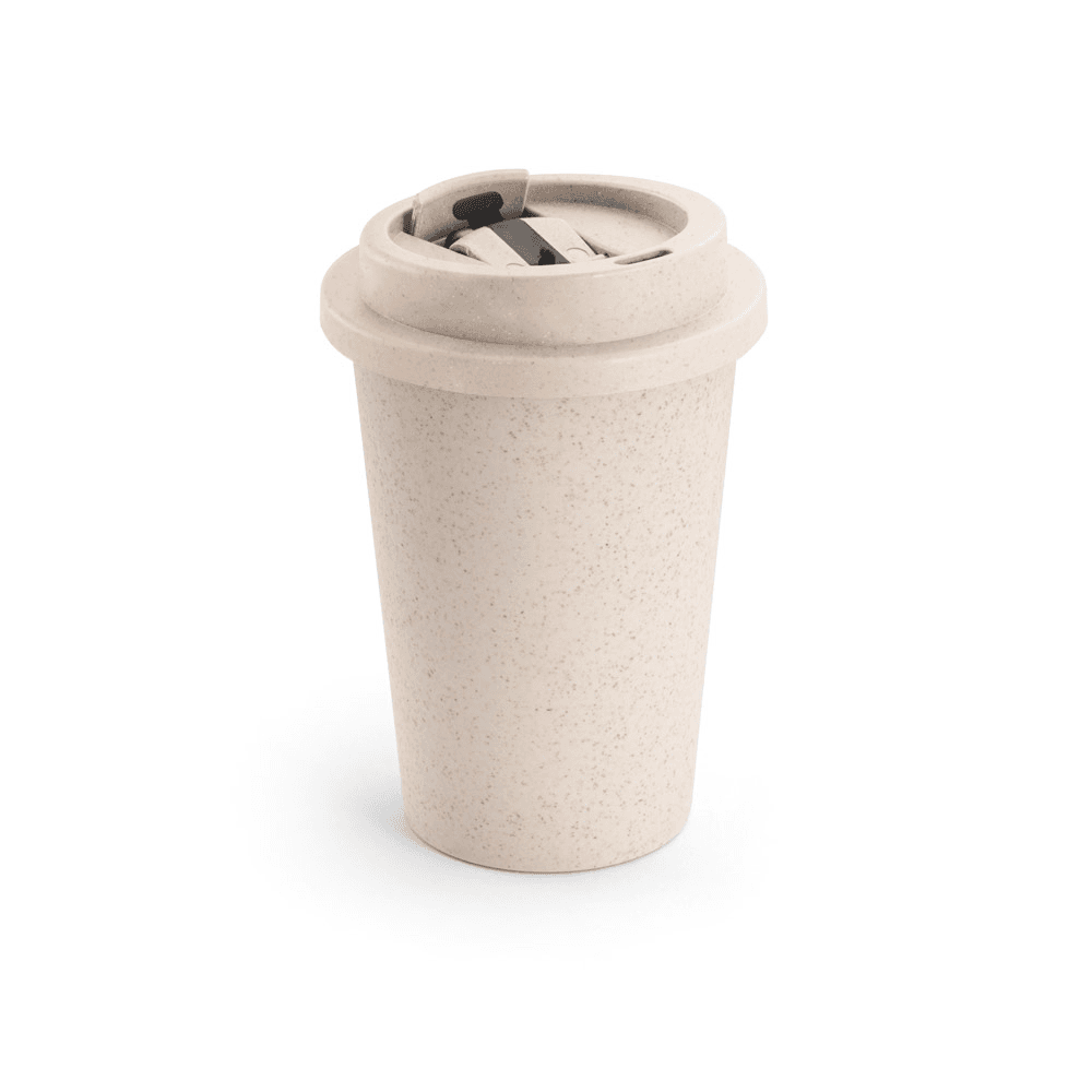 Copo de viagem em fibra de bambu (60%) e PP (40%) com tampa flip top. Capacidade até 380 mL. Certificação EU Food Grade. Ø95 x 113 mm
