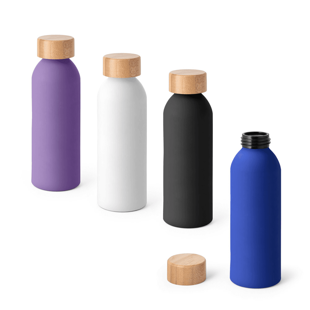 94256 QUETA SOFT. Squeeze em alumínio com acabamento emborrachado e tampa em bambu 550 mL