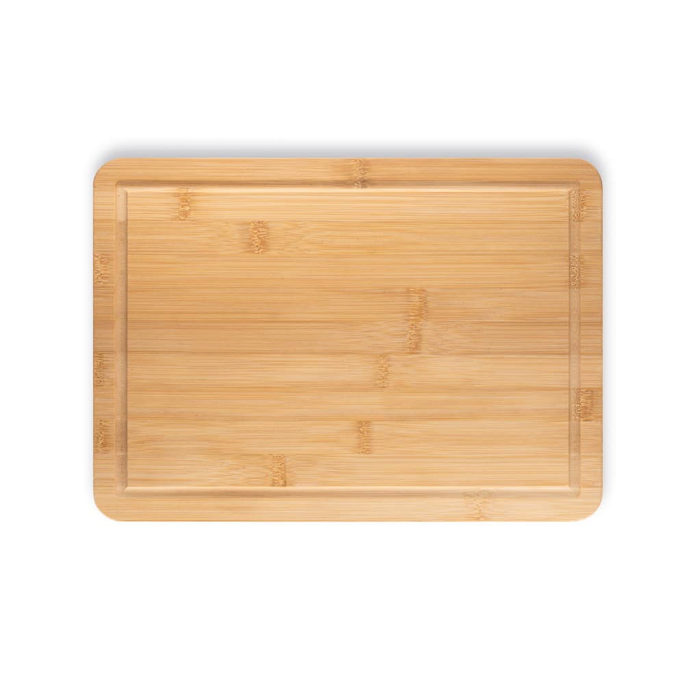 Tábua de corte em bambu. Certificação EU Food Grade. A cor e o resultado da impressão nos materiais naturais pode variar entre produtos. 350 x 250 x 12 mm