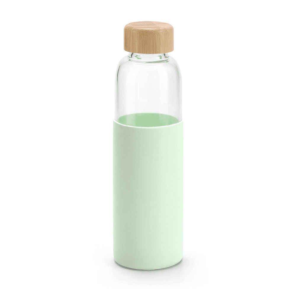 Squeeze em vidro borossilicato com tampa em bambu. Revestido com luva em silicone que oferece uma proteção extra. Capacidade até 600 mL. Fornecido em caixa presente. Certificação EU Food Grade. A cor e o resultado da impressão nos materiais naturais pode variar entre produtos. ø68 x 231 mm