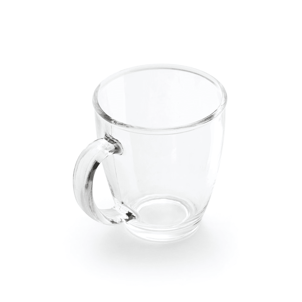 Caneca em vidro. Capacidade até 390 mL. Fornecida em caixa presente. Certificação EU Food Grade. ø91 x 103 mm