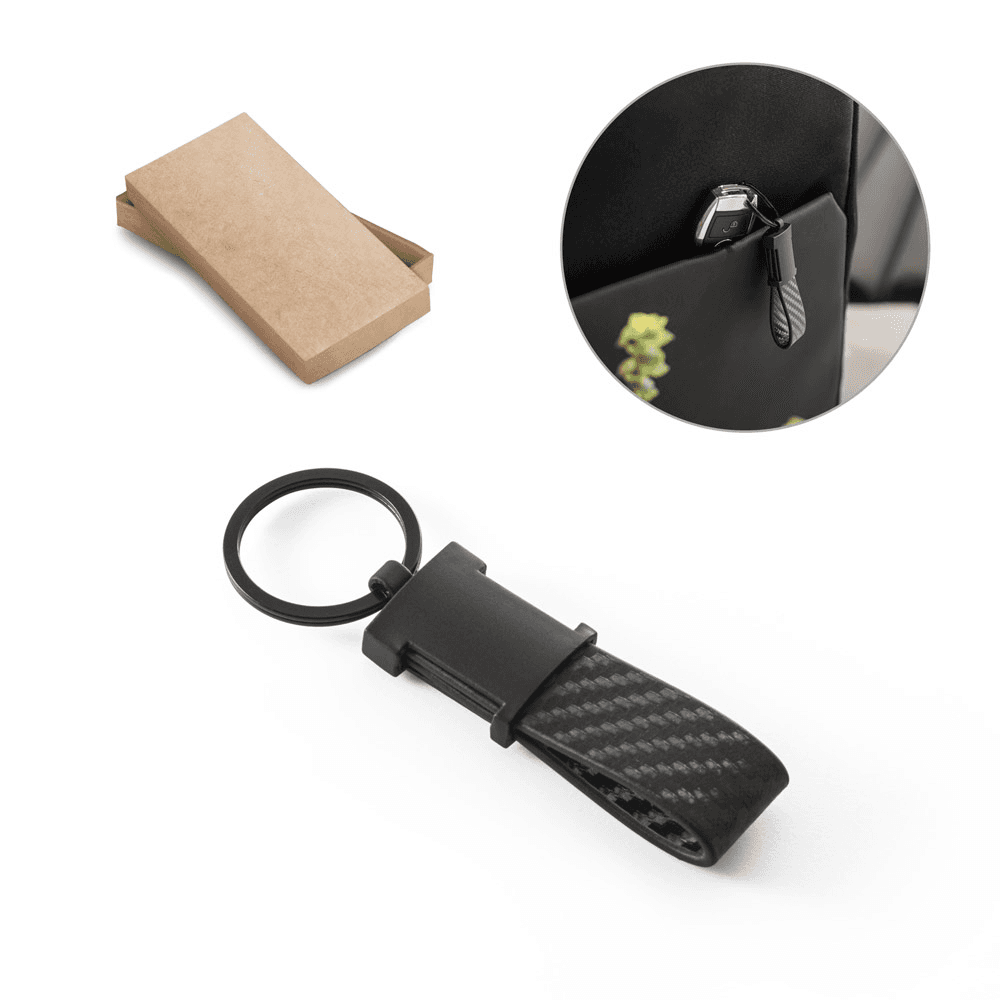 Chaveiro em c. sintético com textura em fibra de carbono e metal. Fornecido em caixa presente de papel kraft reciclado. 35 x 100 x 10 mm