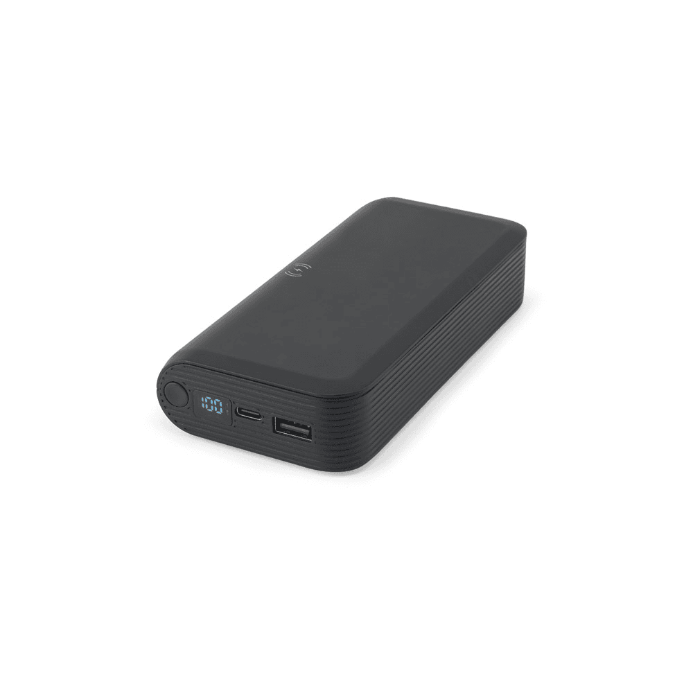 Bateria portátil com carregador por indução (wireless) em ABS 100% reciclado, com capacidade de 20.000 mAh e tela indicadora de nível de carga. A power bank tem uma porta de entrada/saída USB-C e uma porta de saída USB, ambas de carregamento rápido PD 20W. O carregador wireless tem uma potência máxima de 15W. Incluso um cabo de carregamento com saída dupla USB-A/USB-C. Compatível com dispositivos móveis com tecnologia de carregamento sem fios. Fornecida em caixa presente de papel kraft reciclado. 141 x 72 x 29 mm | Caixa: 145 x 93 x 34 mm