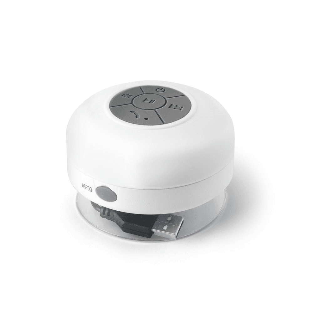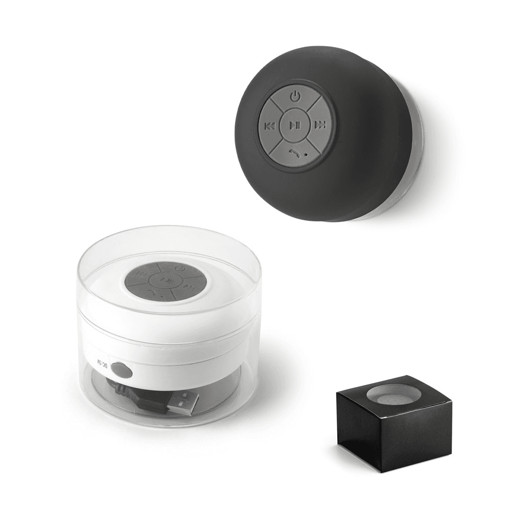 Caixa de som, com microfone, à prova de água em ABS com acabamento emborrachado com ventosa. transmissão sem fios BT v5.0 e potência de 3W/4Ω. Autonomia aproximada de 3 h. Função para atender chamadas, controle de volume e conexão à playlist do dispositivo móvel. Incluso cabo para carregamento. Fornecida em caixa presente. ø85 x 50 mm | Caixa: 88 x 88 x 55 mm