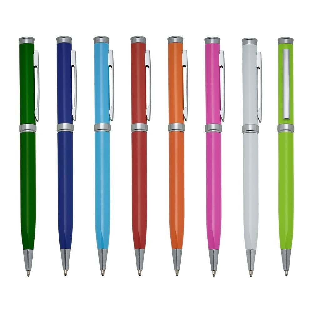 Caneta metálica com carga esferográfica azul 1.0 mm e acionamento por rotação.