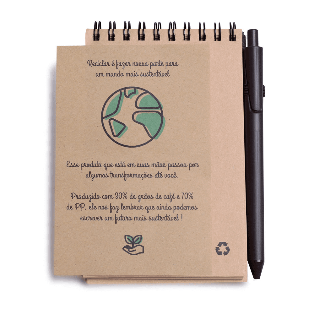 Bloco de anotações 14 x 9cm, Capa produzida com 30% de grãos de café e 70% de PP misto, com wire-o;