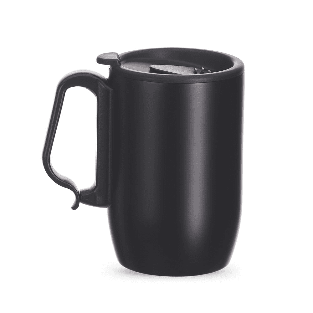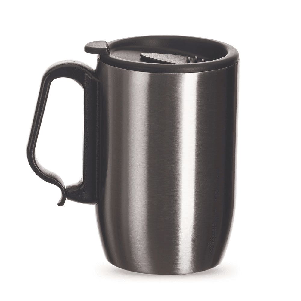 Caneca Térmica em aço inox de 350ml, alça de mão plástica tipo mosquetão, tampa com vedação e base de apoio em EVA.