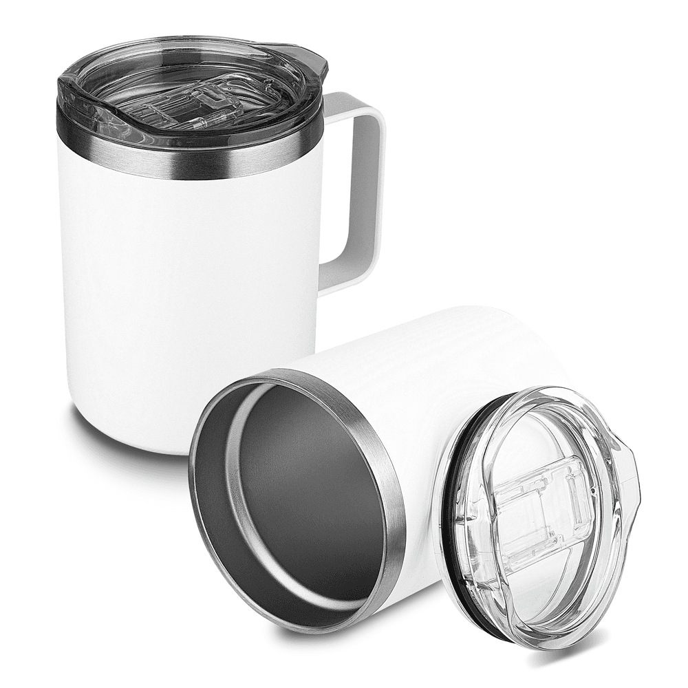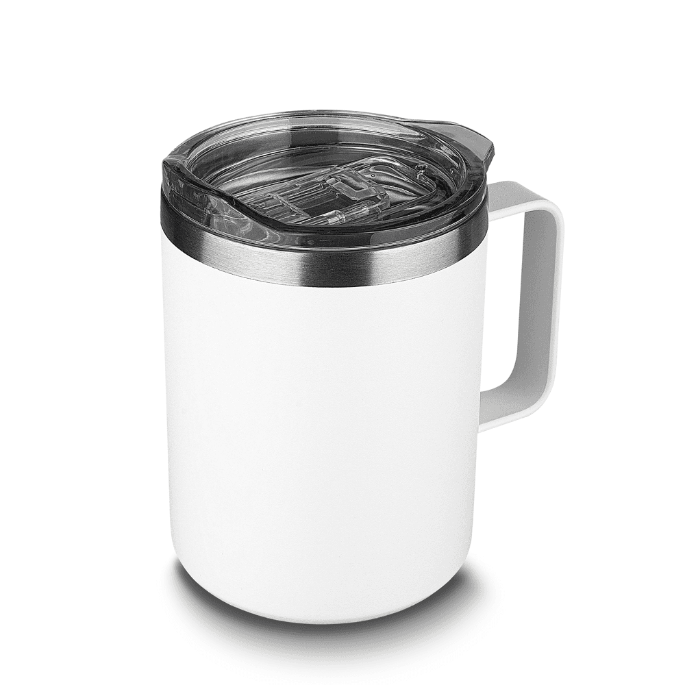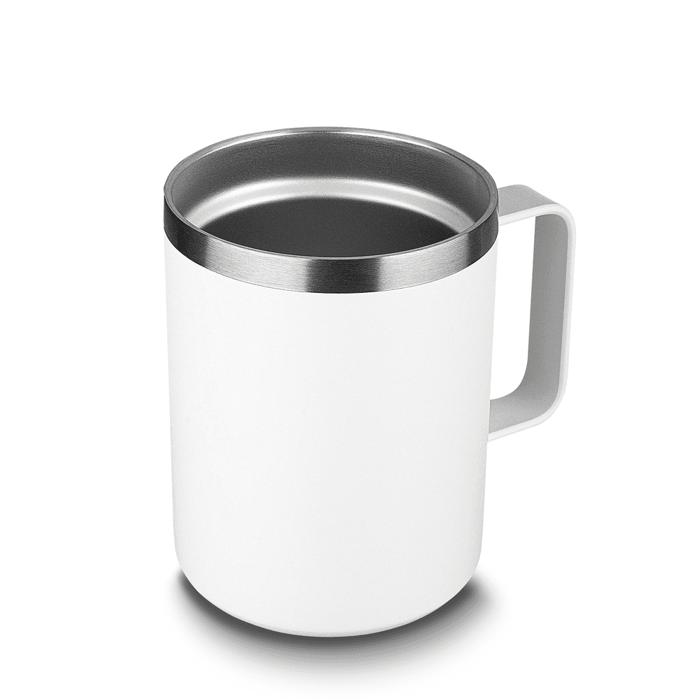 Caneca térmica em aço inox com parede dupla isolada à vácuo, tampa plástica e anel em silicone para vedação, alça lateral. Capacidade 350ml. parede externa com pintura a pó.