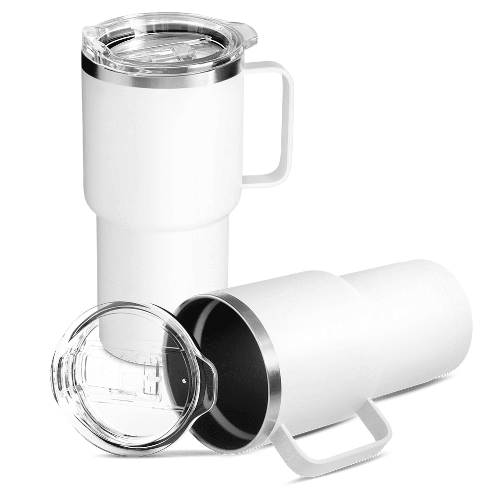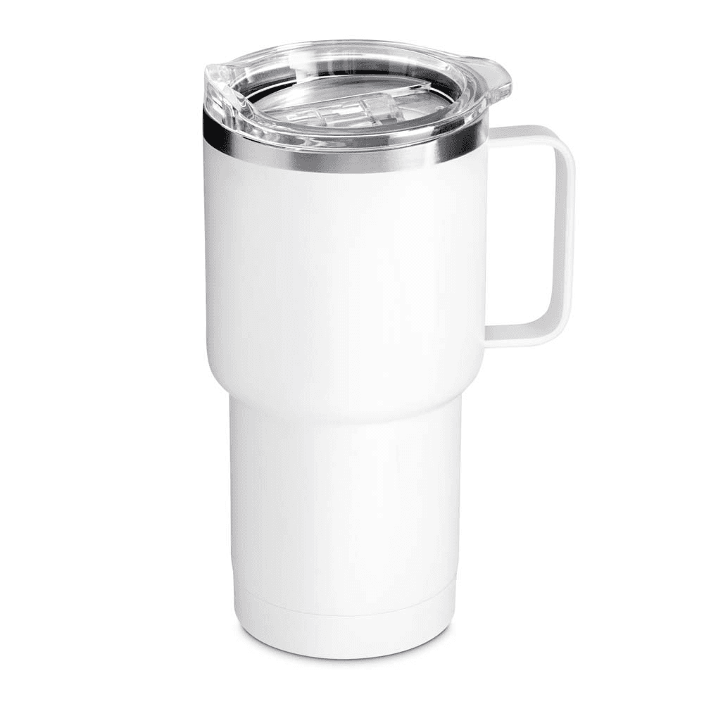 Caneca térmica em aço inox com parede dupla isolada à vácuo, tampa plástica e anel em silicone para vedação, alça lateral. Capacidade 600ml, parede externa com pintura a pó
