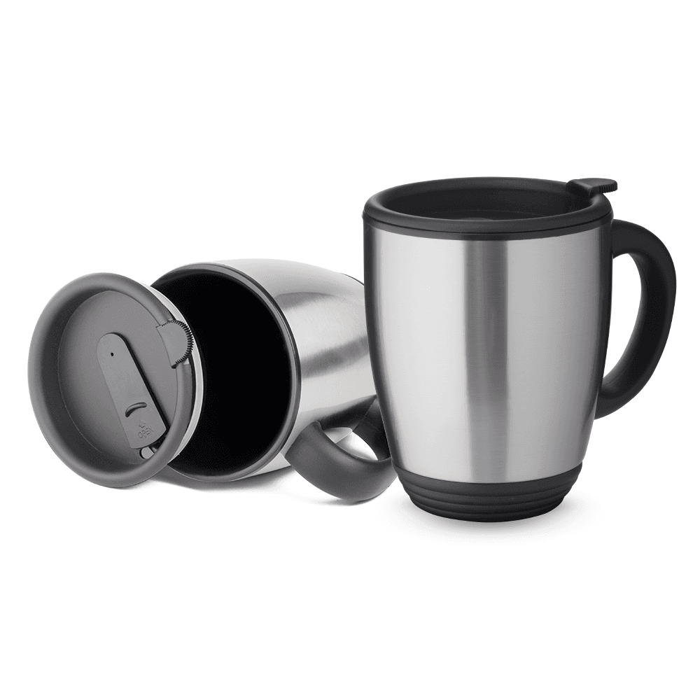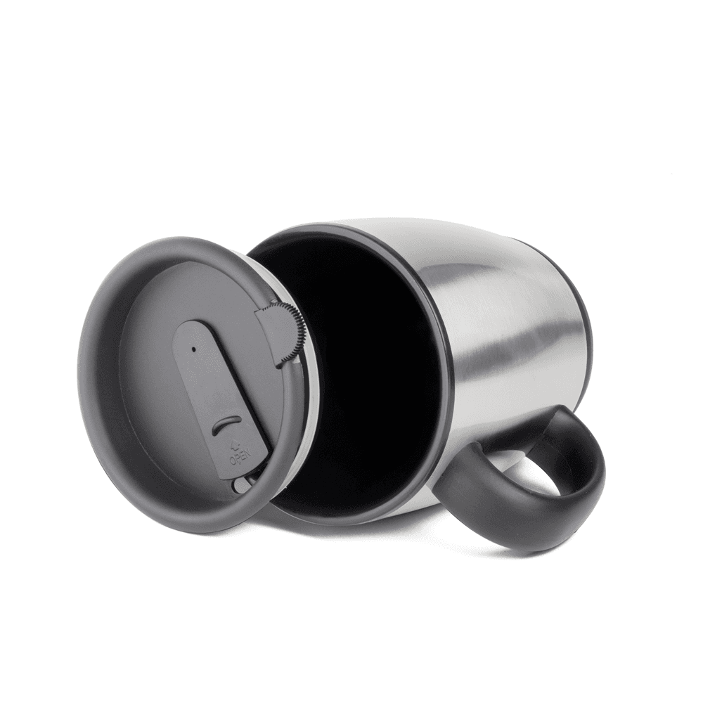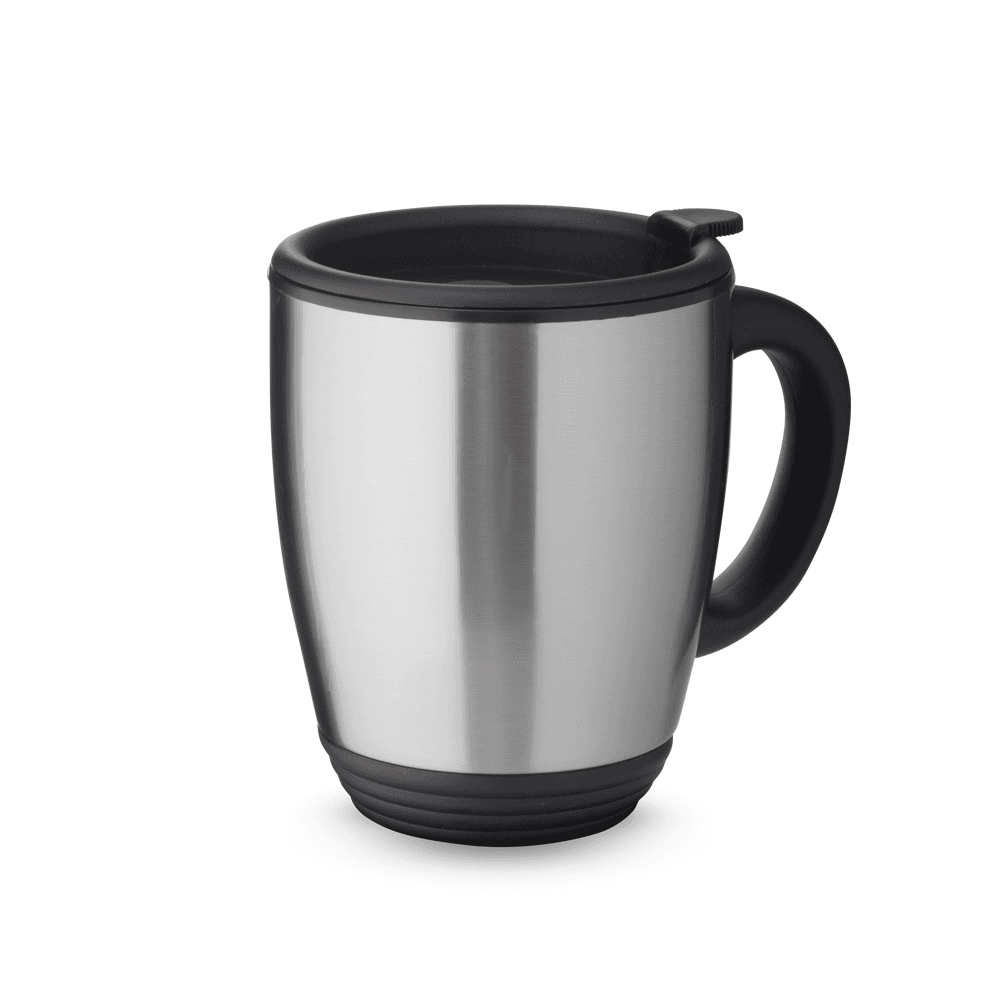 Caneca em aço inox na parte exterior e interior em plástico com capacidade de 450ml, alça de mão plástica, tampa com vedação ideal para chás e cafés.