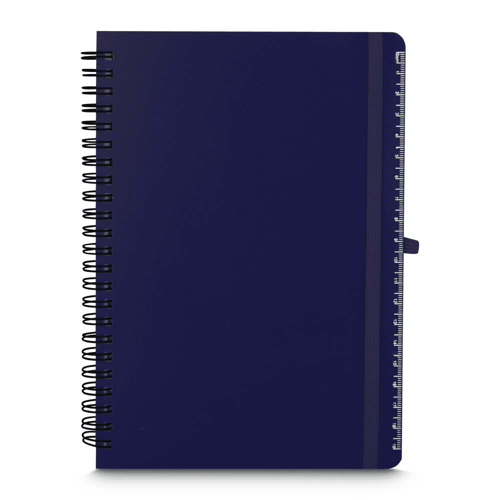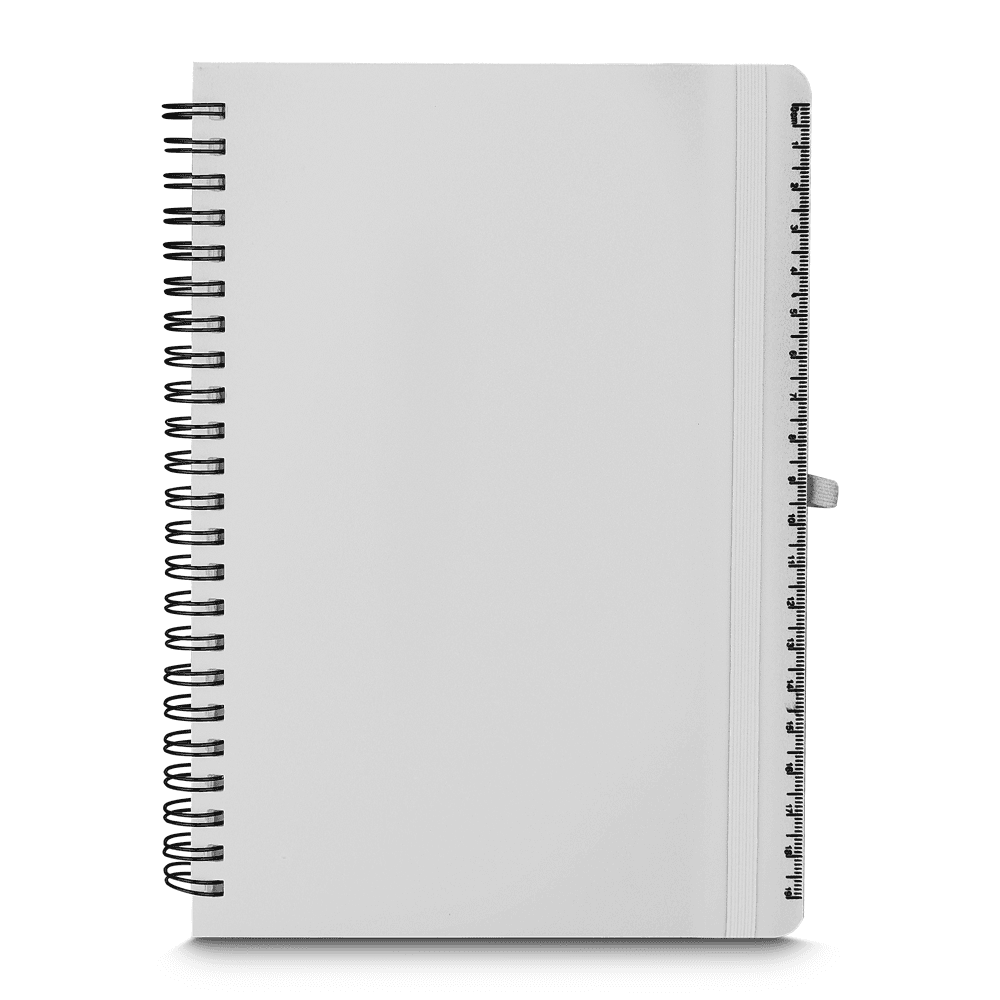 Caderno de anotações em PP(Polipropileno) reciclável com suporte para caneta e miolo de 70 folhas brancas pautadas.