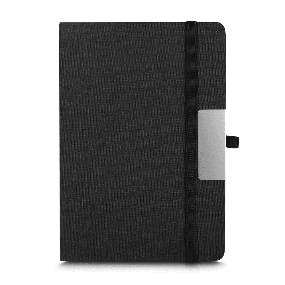 O caderno de anotações é feito de PET Reciclado, acompanha placa em metal, em capa dura com miolo 80 folhas pautadas na cor bege.