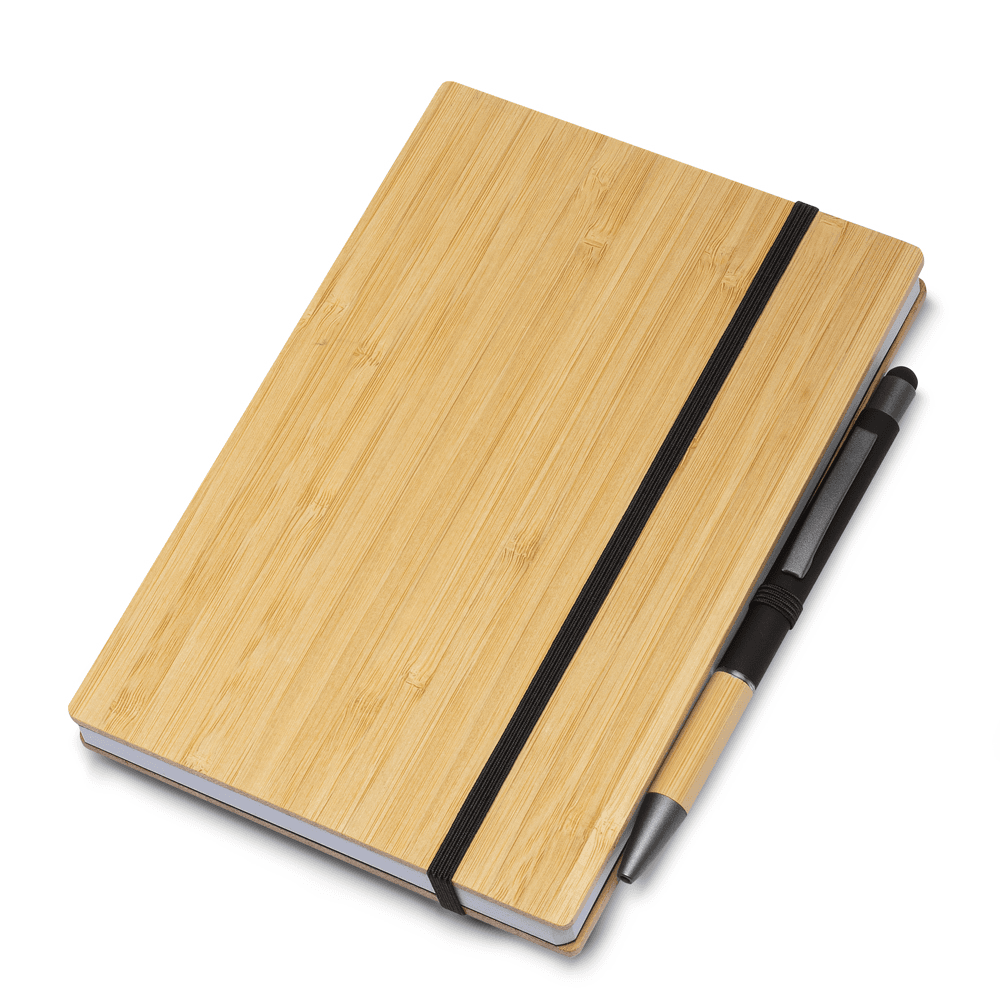 Caderno de anotações com elástico e suporte para caneta, capa dura com 3mm em material reciclável imitando bambu , miolo com 96 folhas pautadas na cor branca. Não acompanha caneta.
