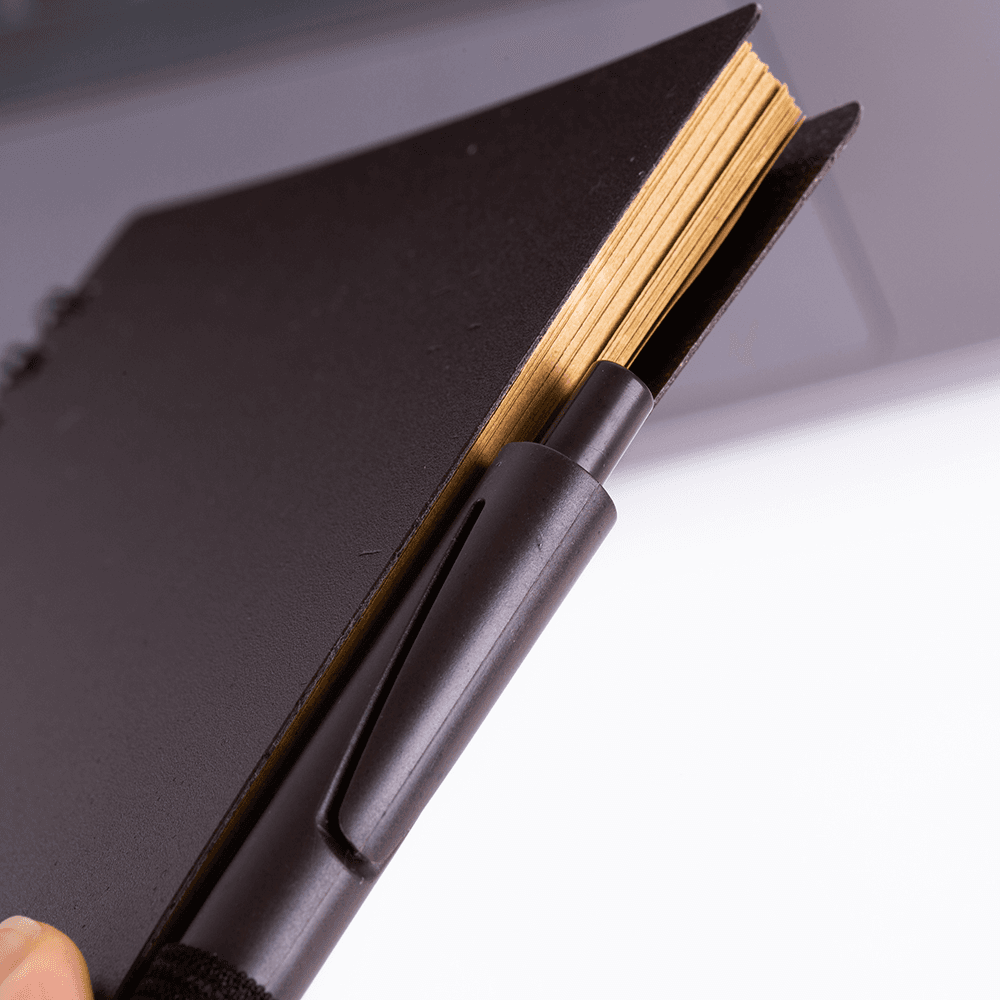 1 Caderno 21x14,5cm, Capa produzida com 30% de grãos de café e 70% de PP misto, com suporte para canetas e miolo com 70 folhas pautada bege;