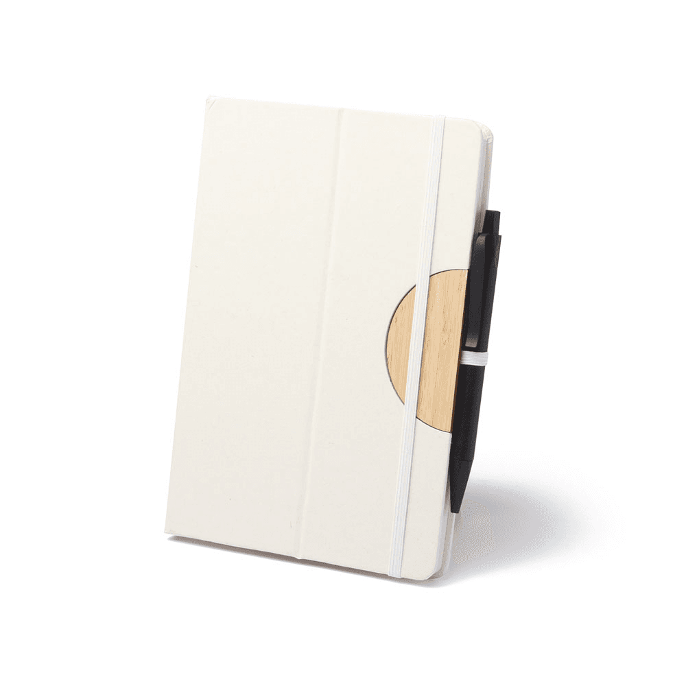 Caderno com tampa de função de suporte para smartphone. Produzido com caixa de leite, possui guarnições em bambu, porta canetas e elástico branco com 80 folhas (g/m2) pautadas na cor bege.
