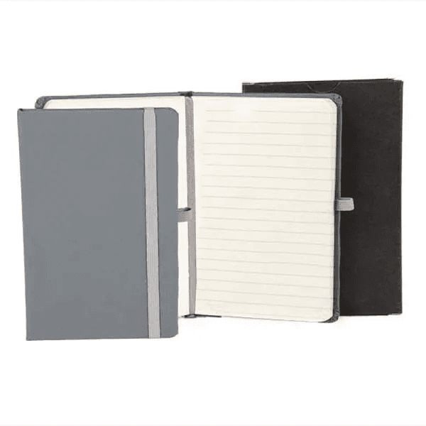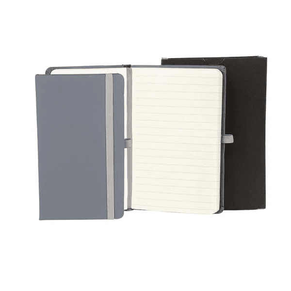 Caderno para anotações cinza com capa dura. Conta com 80 folhas pautadas, marcador de página, porta caneta e elástico para fechamento. Gramatura da folha de 70 g/m2.