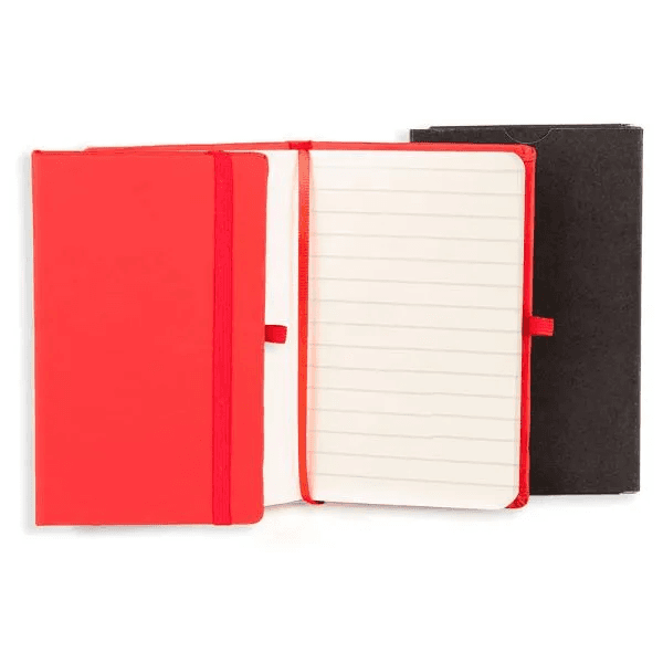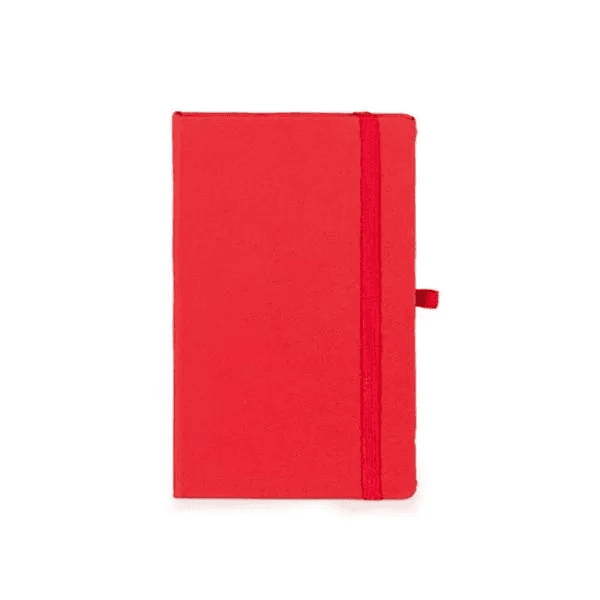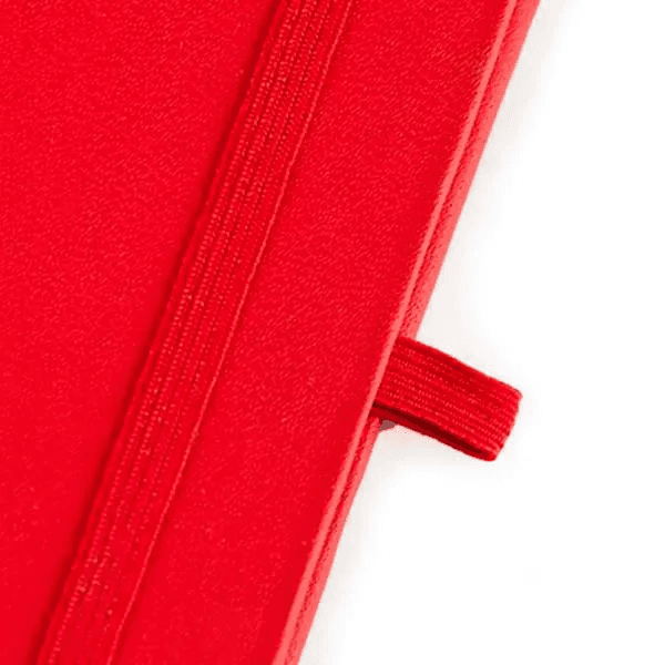 Caderno para anotações vermelho com capa dura. Conta com 80 folhas pautadas, marcador de página, porta caneta e elástico para fechamento. Gramatura da folha de 70 g/m2.