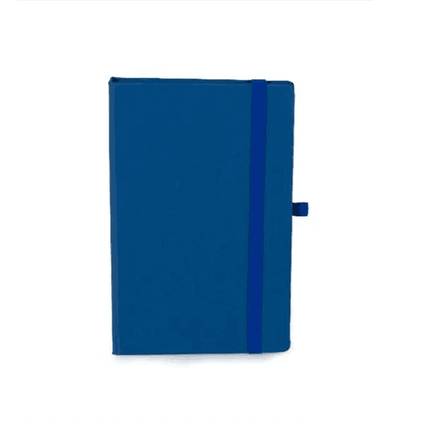 Caderno para anotações azul com capa dura. Conta com 80 folhas não pautadas, marcador de página, porta caneta e elástico para fechamento. Gramatura da folha de 70 g/m2.