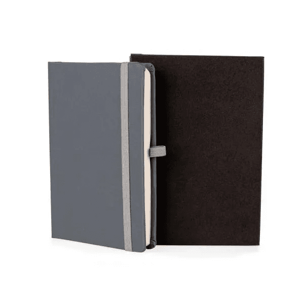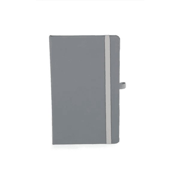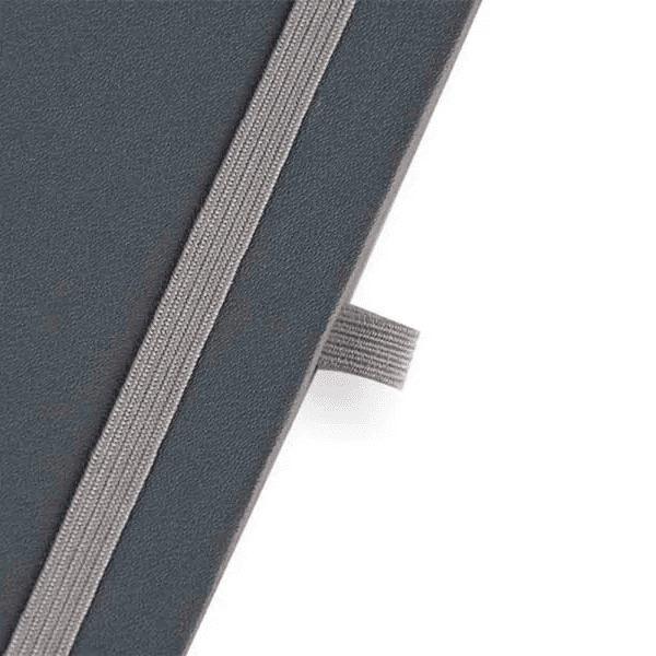 Caderno para anotações cinza com capa dura. Conta com 80 folhas não pautadas, marcador de página, porta caneta e elástico para fechamento. Gramatura da folha de 70 g/m2.