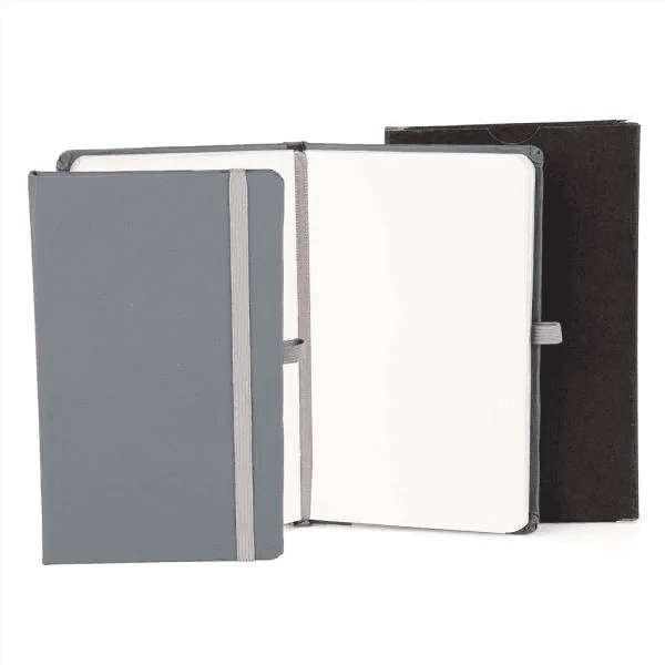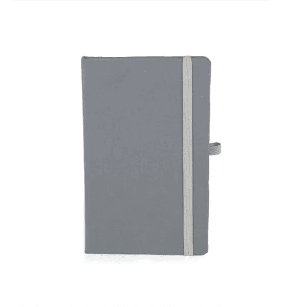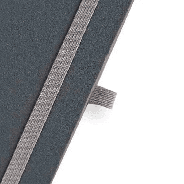 Caderno para anotações cinza com capa dura. Conta com 80 folhas não pautadas, marcador de página, porta caneta e elástico para fechamento. Gramatura da folha de 70 g/m2.