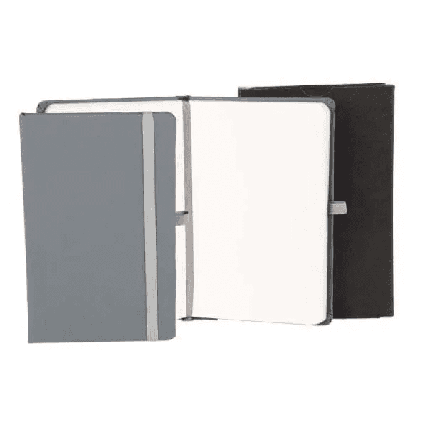 Caderno para anotações cinza com capa dura. Conta com 80 folhas não pautadas, marcador de página, porta caneta e elástico para fechamento. Gramatura da folha de 70 g/m2.