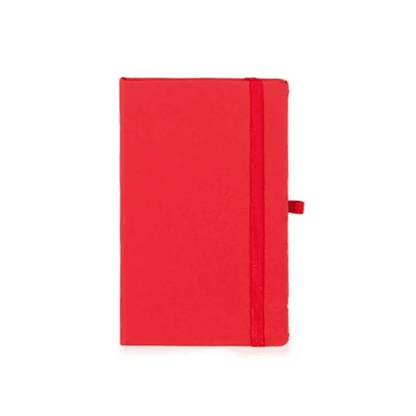 Caderno para anotações vermelho com capa dura. Conta com 80 folhas não pautadas, marcador de página, porta caneta e elástico para fechamento. Gramatura da folha de 70 g/m2.